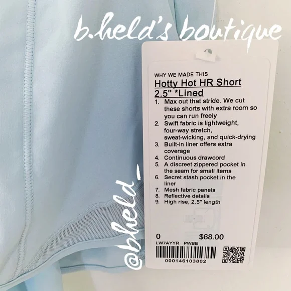 Description:lululemon "Velvet Dust & Powder Blue" Hotty Hot HR Lined Short Bundle.⚛️💨 Hotty Hot HR Short Bundle Includes:• lululemon Hotty Hot High-Rise Lined Short 2.5" in Velvet Dust (VLVD).• lululemon Hotty Hot High-Rise Lined Short 2.5" in Powder Blue (PWBE).🏃🏻♀️Designed for running.🏁Ready to race.🧶Made of Swift fabric.🩲Has a built-in liner.🙈Sold Out.🎞Additional photographs of both shorts can be found in their individual sale listings in my boutique.⛔️This bundle is excluded from ALL further discounts.📱To purchase it, please use the "Buy Now" button.Size:Both pairs of shorts are Size 0.Condition:Brand New With Tags (NWT). Never Worn! Authentic.About B.Held’s Boutique:🏆Buy with confidence from aAmbassador II with over 200 love notes!📉I am a lululemon enthusiast and investor.👚I sell only authentic lululemon.🔖I always show dot tags to prove authenticity.📵Anyone else using my photos does not have my permission.👩💻Use code BHELD_ when creating youraccount, save $10 on your first purchase!...Before Asking Questions, Please Note:📷All photos are original.☀️All photos are taken in natural light.🧺All items are stored in a smoke-free, pet-free home.📦All orders will ship within 1-3 business days.🛍Bundle 2+ items to save!🪨Unless bundled, the prices are FIRM.🚫I do not trade.💌 For other questions, please send me a bundle message.