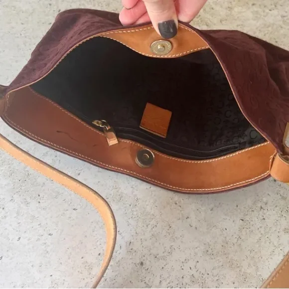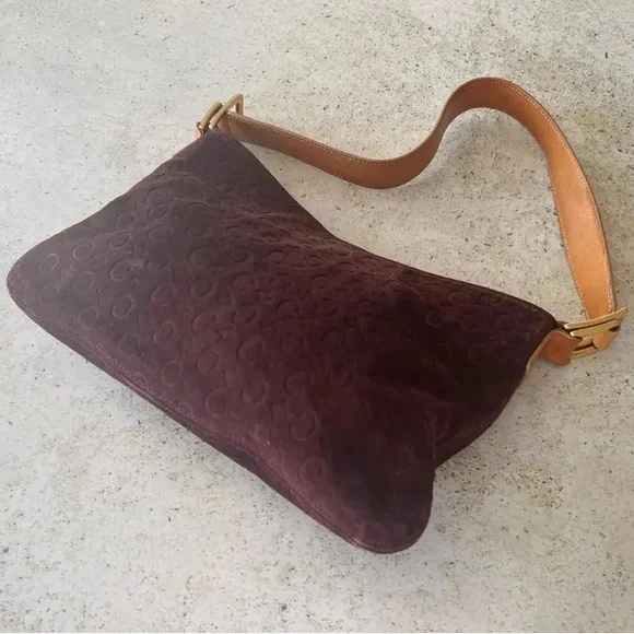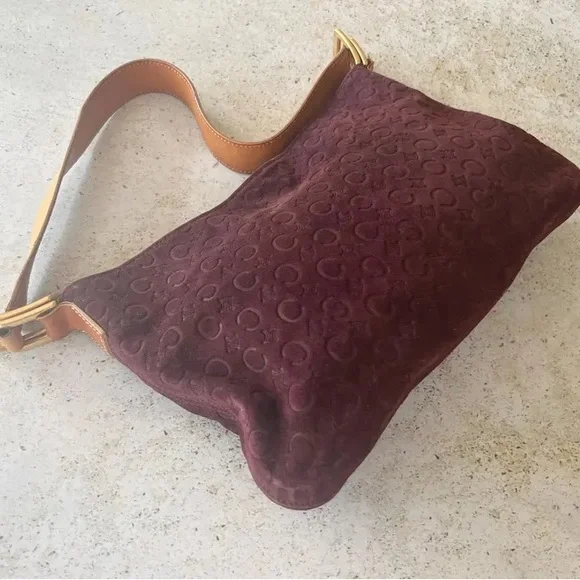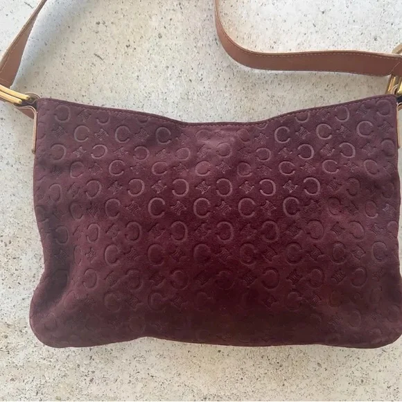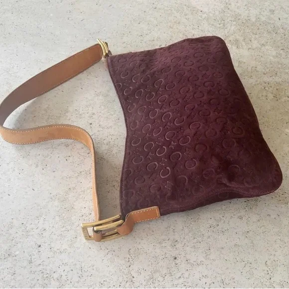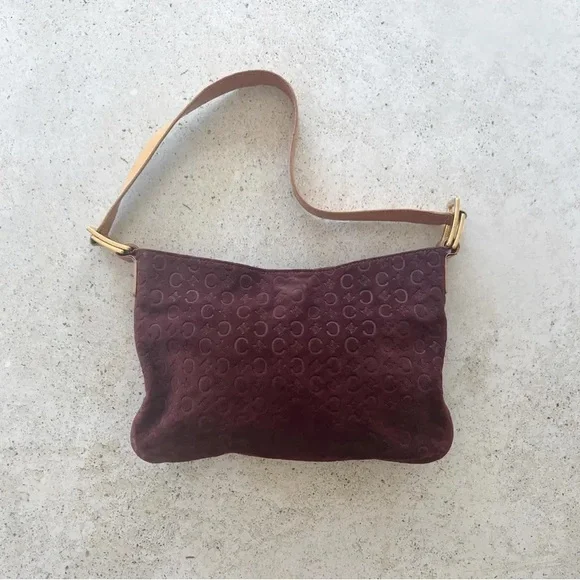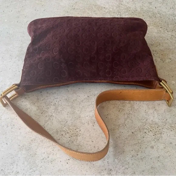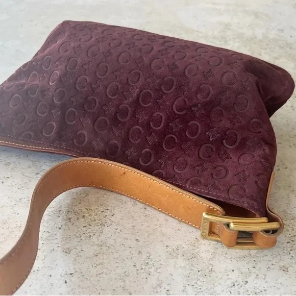 Authentic CELINE Macadam shoulder bag in good vintage condition. Logo embossed suede exterior, leather shoulder strap. Canvas lined interior, one interior zippered pocket. Gold hardware. Magnetic snap closure. Please refer to all photos for wear, specifically for some wear and discoloration on suede. Bag is in overall great condition for its age.Bag measures 11" W x 7" HShoulder strap drop length of 10"