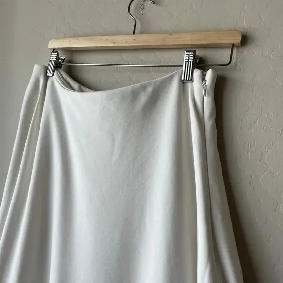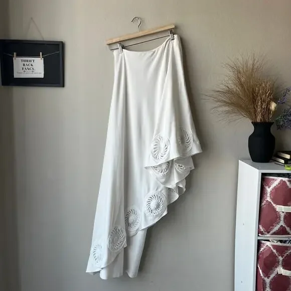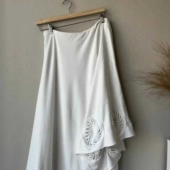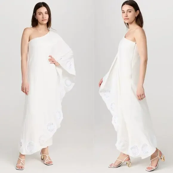 Experience effortless elegance in the bridal Abia Dress by Elexiay. Crafted by Nigerian artisans, this dress features intricate crochet trim and a graceful drape. The one-shoulder design and single long sleeve add unique details to this maxi dress, while the lining ensures comfort and coverage. Elevate any occasion with this handcrafted piece. Solid white. Size small. 62% viscose, 33% nylon, 5% spandex.Very good pre-owned condition, very faint spots on side shown + mark along slip hem. Approximate measurements: Length: 54“ Pit to pit: 14“E2.