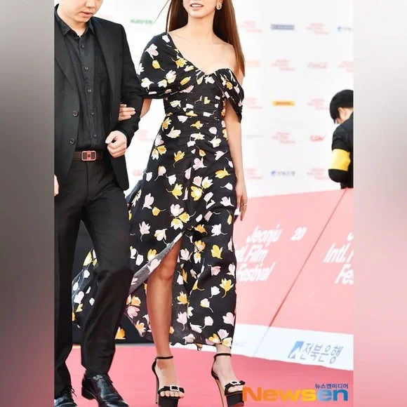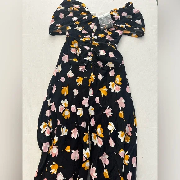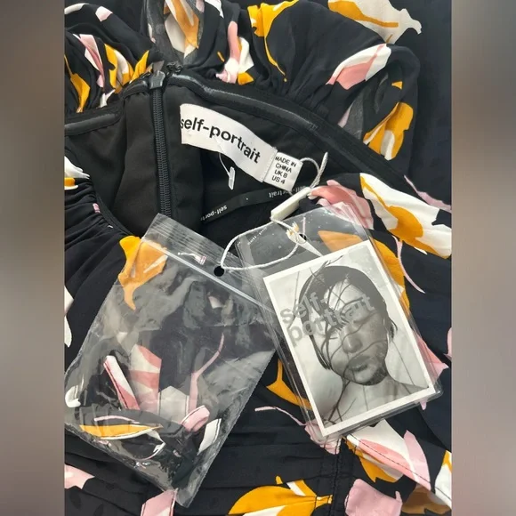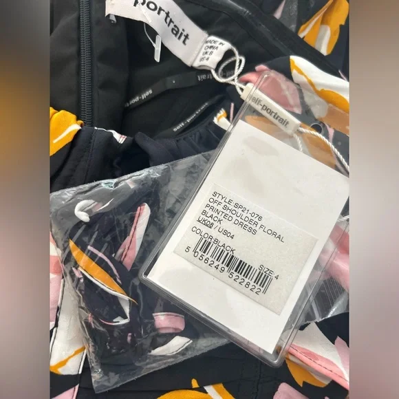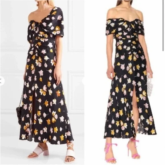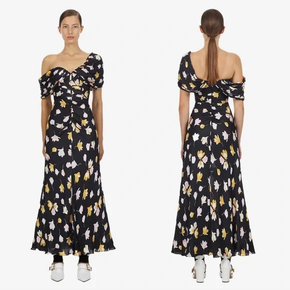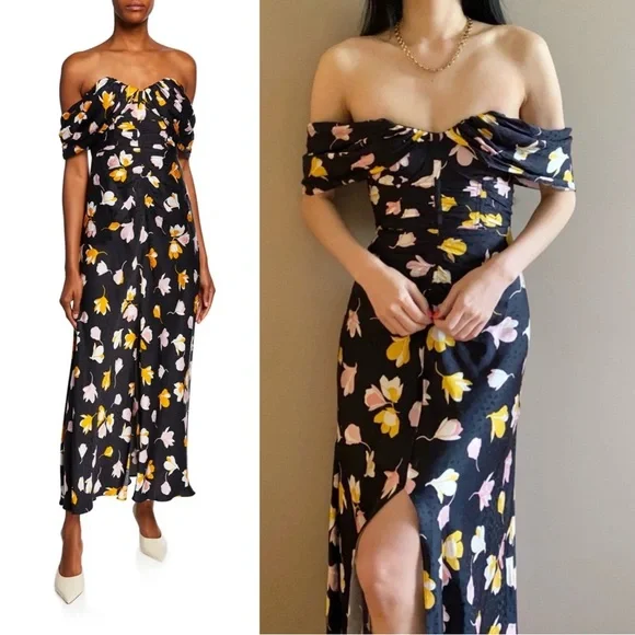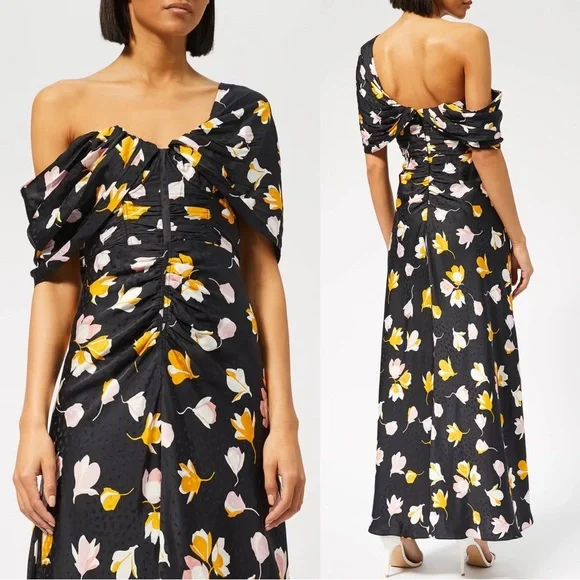 New with tags.Self Portrait’s elegant off-the-shoulder dress showcases a graphic mustard, blush and white floral print on a luxurious base of black jacquard satin. The dress features a ruched body, structured with corset boning and supportive under-wiring. The fitted bodice emphasises the waist and flatters the figure, including a non-stick strip to ensure a secure fit.Two wide gathered satin straps can be worn on or off-the-shoulder to allow versatile wear. The sophisticated maxi skirt is given a contemporary update with a front split that creates movement. Fully lined and fastened with a concealed zip.Main: 100% Viscose. Lining: 100% Polyester.