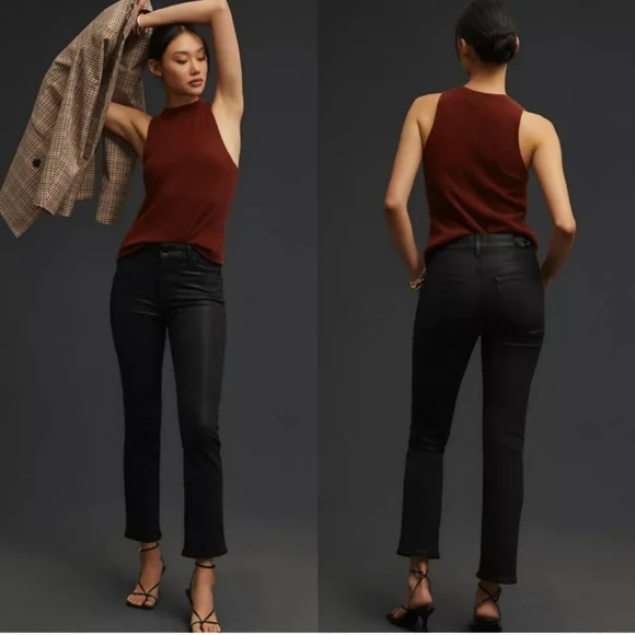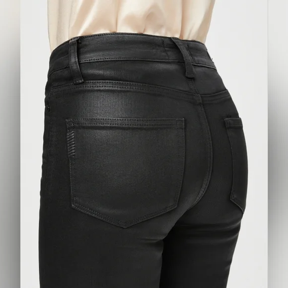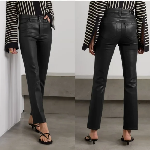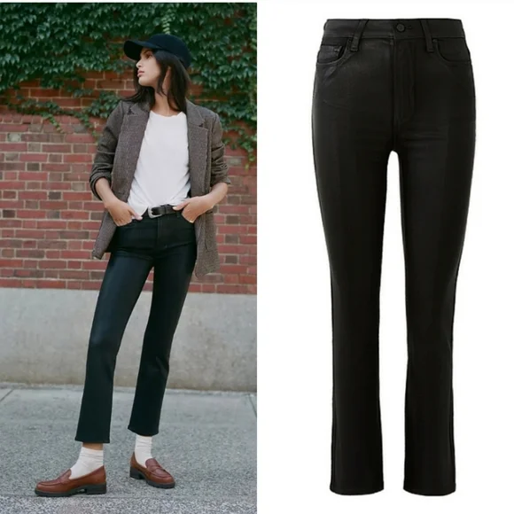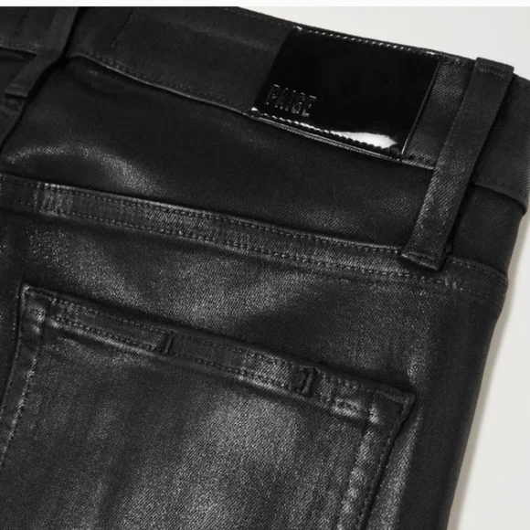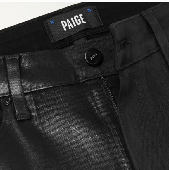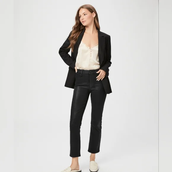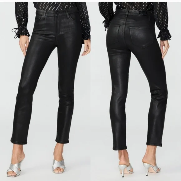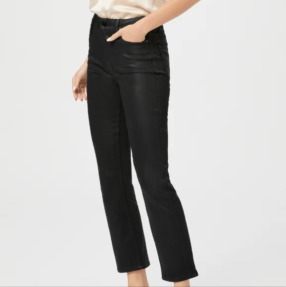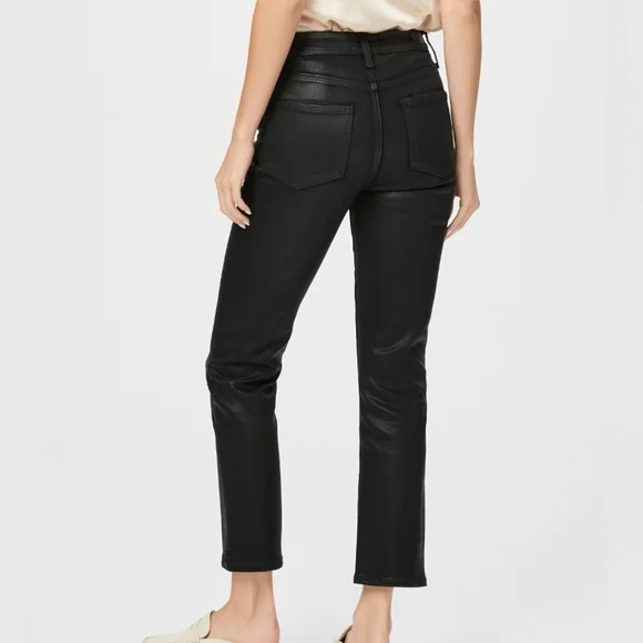 PAIGE Petite Size 32 Cindy - Black Fog Luxe Coating. NWT. Inseam: 25 inchesRise: 11 inchesA luxe addition to your wardrobe, this high-rise straight leg is absolutely stunning in classic black. This super flattering style has a leather-like look, but doesn't sacrifice comfort. Cut from our coated TRANSCEND denim, this style is luxuriously soft with plenty of stretch and recovery to give it a flawless fit from morning to moonlight.