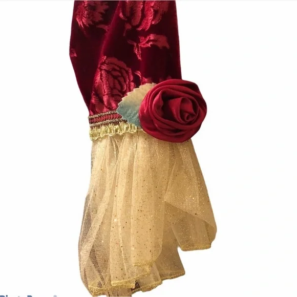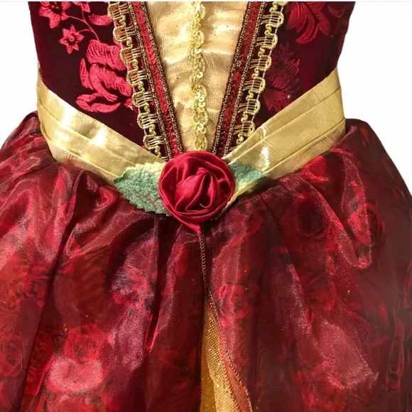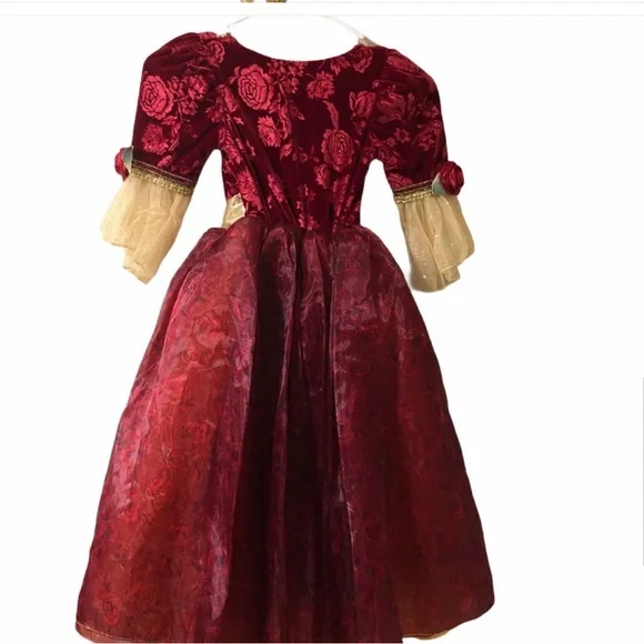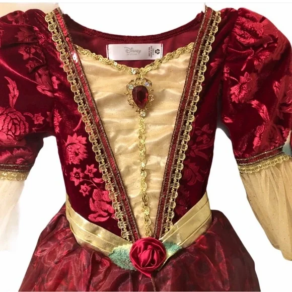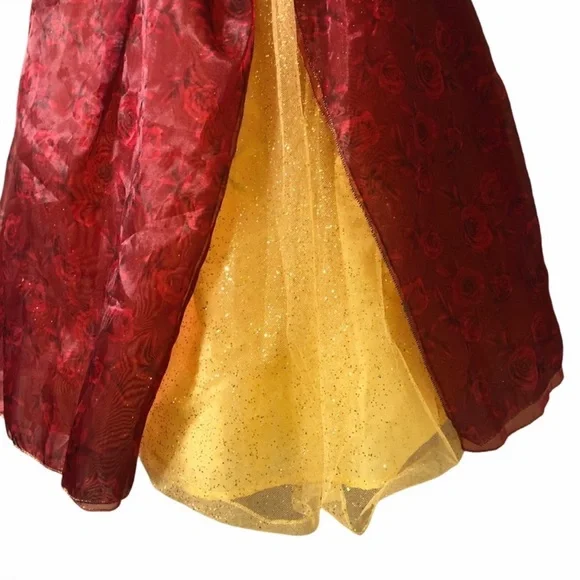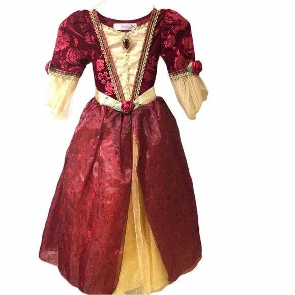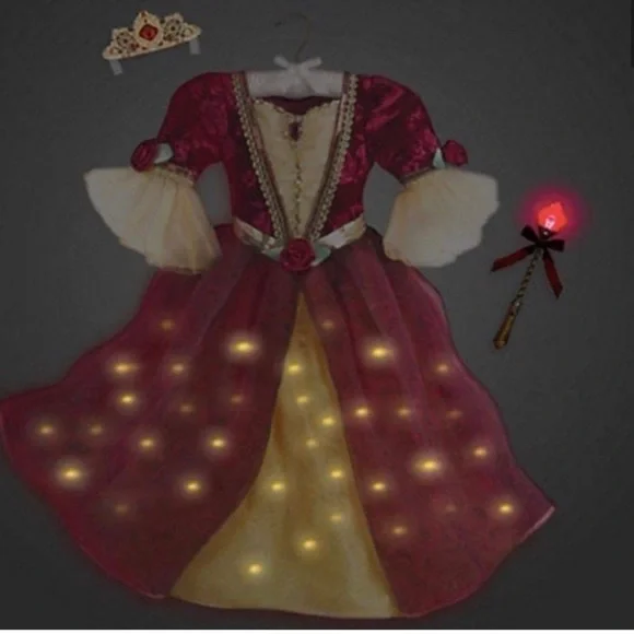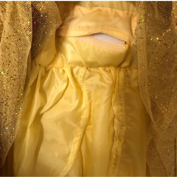 Beauty and the beast dress. This dress came from the Disney shop only able to be bought as Disney land. Size is a 4/5 and has lights in the dress. The lights are not working I’m not sure what is wrong. Dress is full of tensile to give the dress the real princess poof and look of a beautiful ball gown. This is the dress alone crown and wand do not come with it