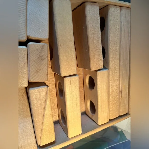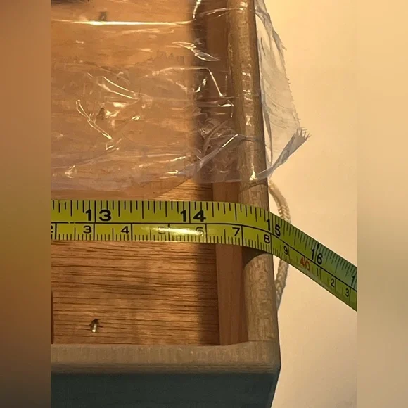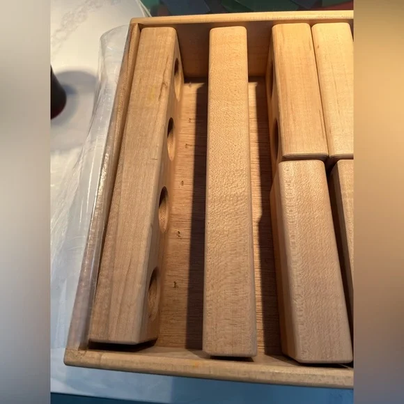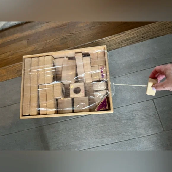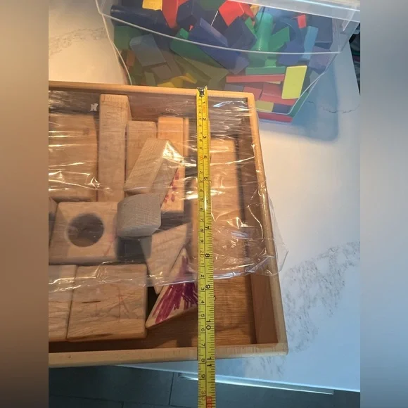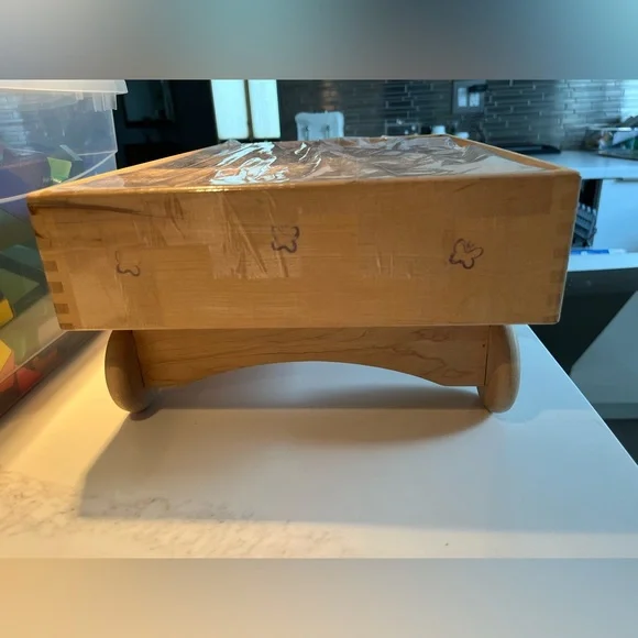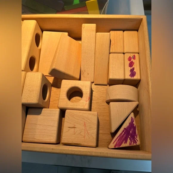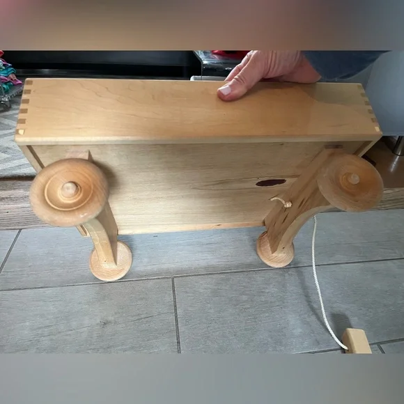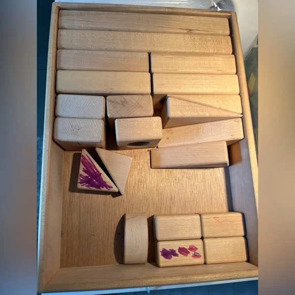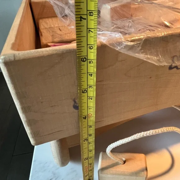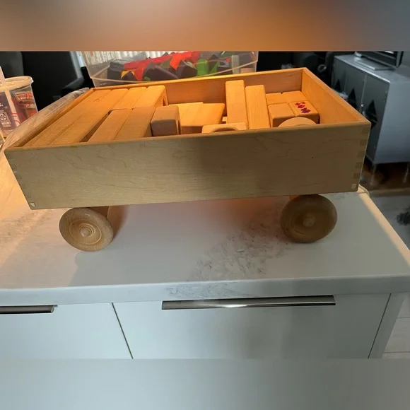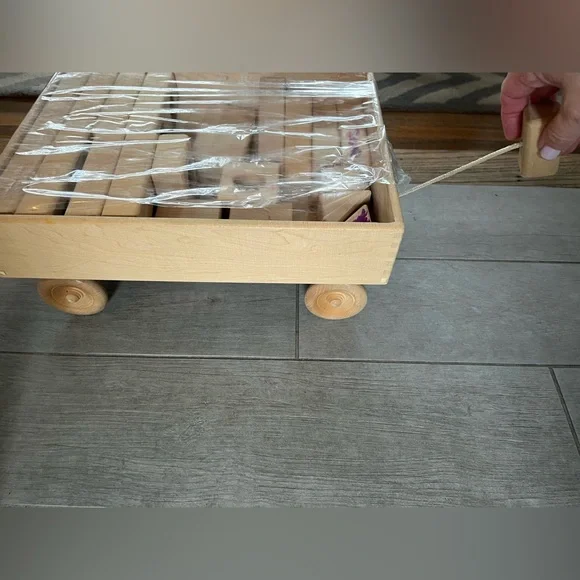 Fabulous kids Wooden wagon with pull string plus 21 wooden blocks.All different sizes blocks included. Wagon can hold more than the 21 included blocks.Measures approx 15” long x 11” wide x 6.5” high. There are butterfly’s stamped on the sides of the wagon.Two of blocks have purple marker on them and the bottom of the wagon has a colored spot.The wheels roll and the wagon moves in good condition.