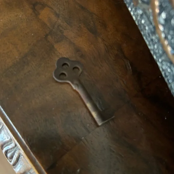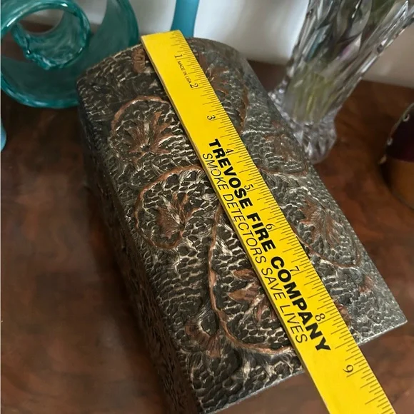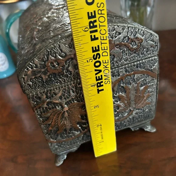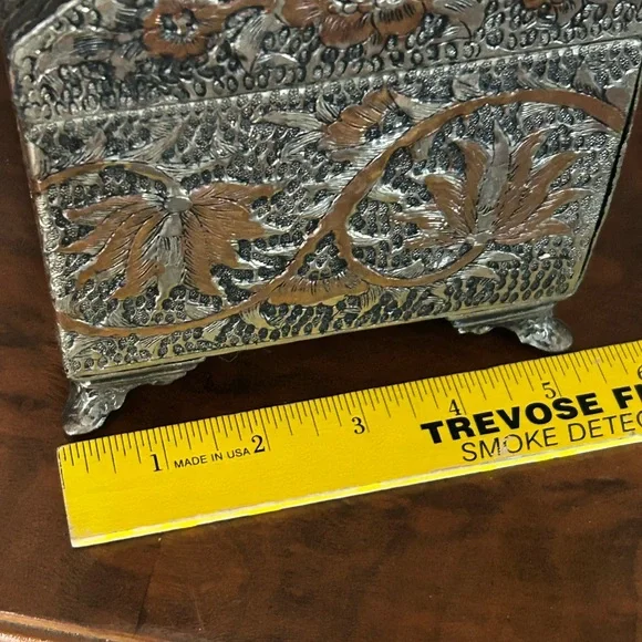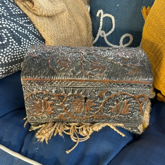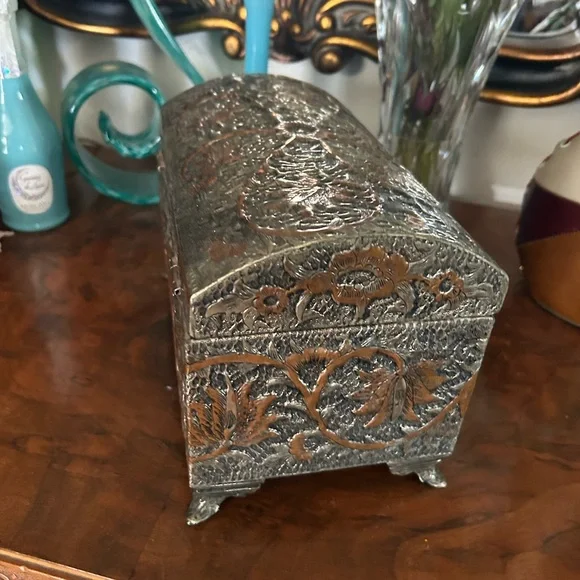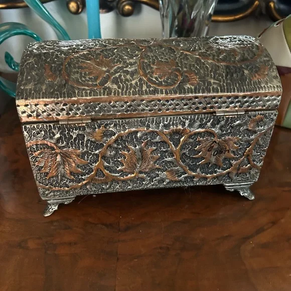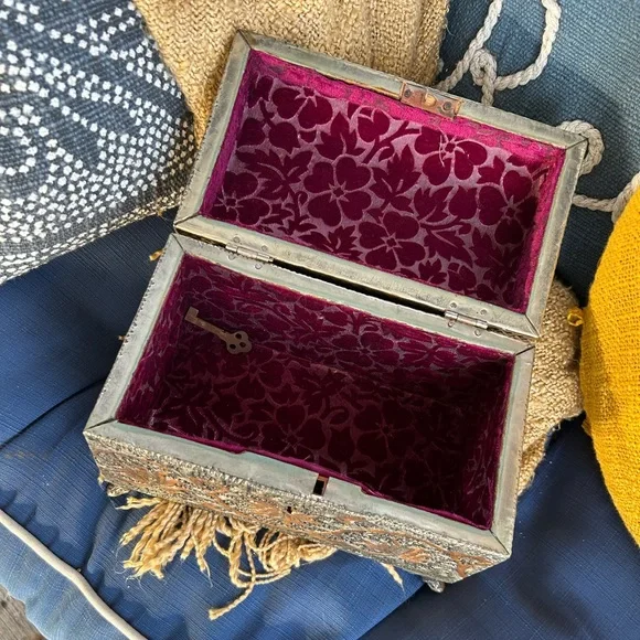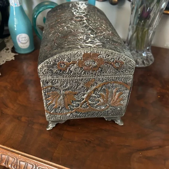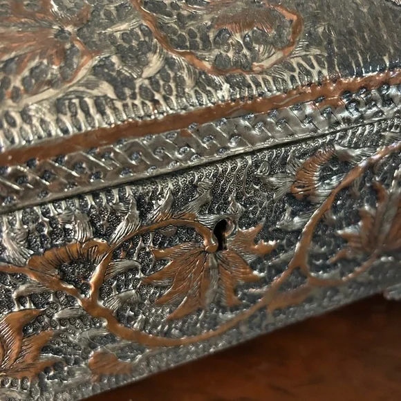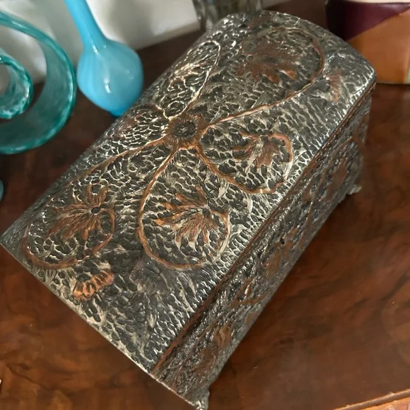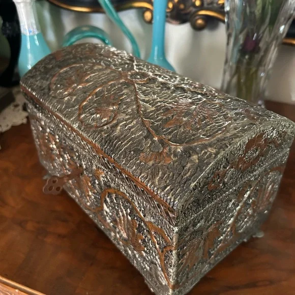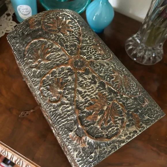 Antique Silver Plate & Copper Repousse Jewelry Box with original Skeleton Key. Silver and Copper-plated with a decorative, embossed design. The box is likely lined with cedar wood, commonly used for storing delicate items, and then lined in a velvety & satiny burgundy flower and leaf fabric. The style is reminiscent of Art Nouveau. Measurements shown in photos. Amazing Detail. In great preowned condition with no issues. Only the Skelton key shows rusty wear. Smoke-free home.