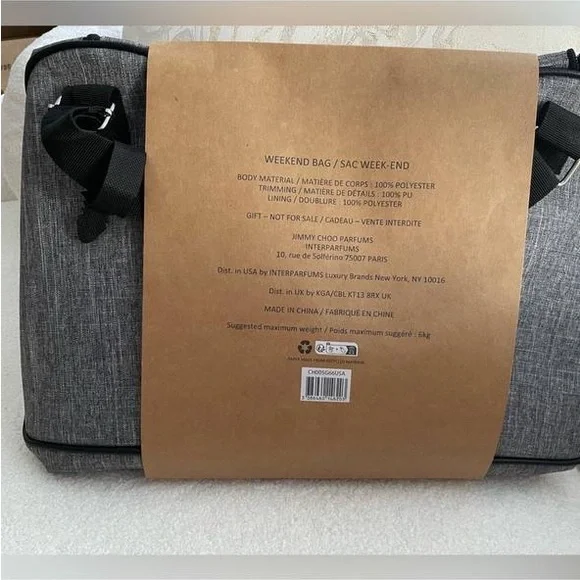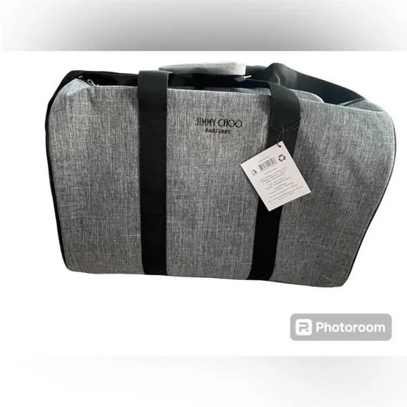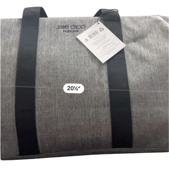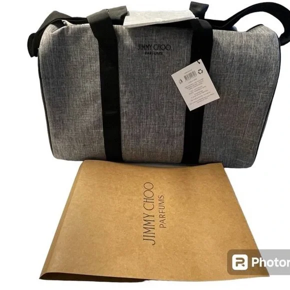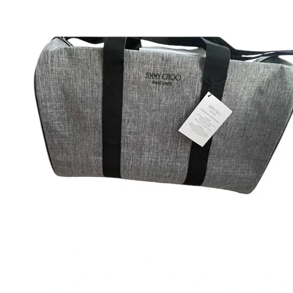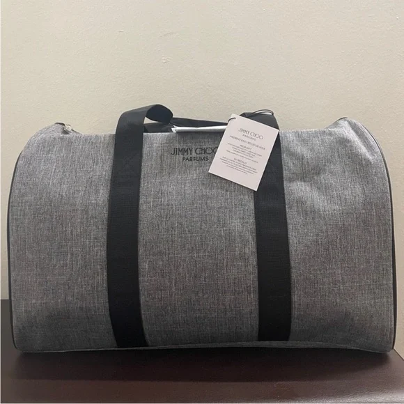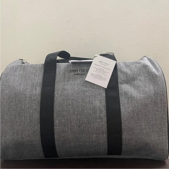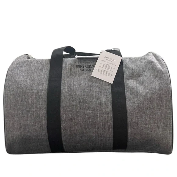 Jimmy Choo Man Parfums Duffle Bag WeekenderTravel Gym HandbagStylish and modern JIMMY Choo weekender bag ideal for work, weekend getaway or the gym. When not in use, the duffel bag folds into a flat, compact size, taking up minimal space on a shelf or in a closet. This is a spacious limited edition bag from the Jimmy Choo Fragrance Collection.Grey colorOne main compartment with top zip fastening closureJimmy Choo Parfums logo silver-tone zipper pullsFully LinedMaterial: Exterior - 100% polyester; Lining - 100% polyesterApproximate Dimensions 20inchW x 12.5hIntegrated adjustable shoulder body strap; maximum 47"Approx. Handle Drop: 8"Limited EditionBrand New With Tags
