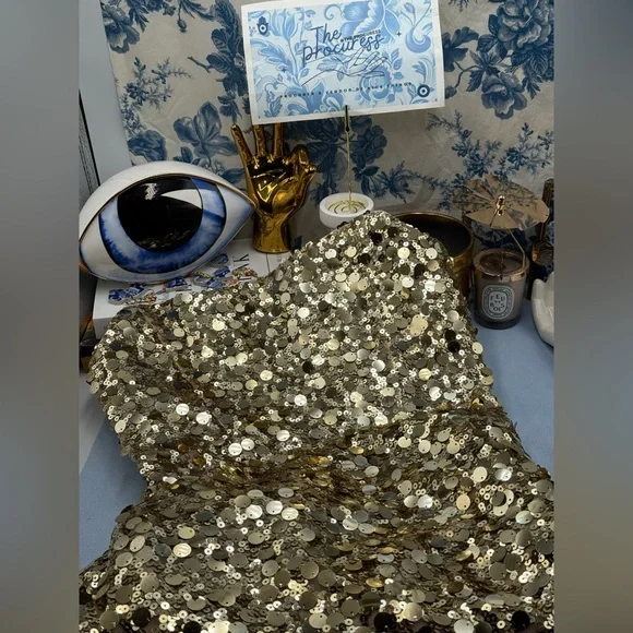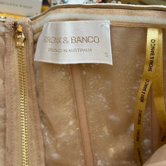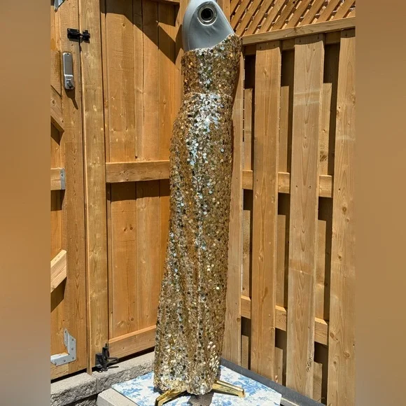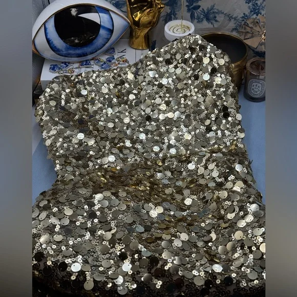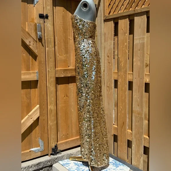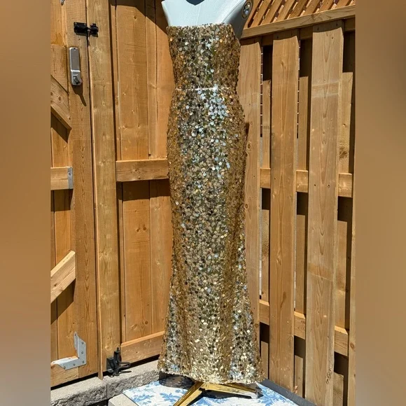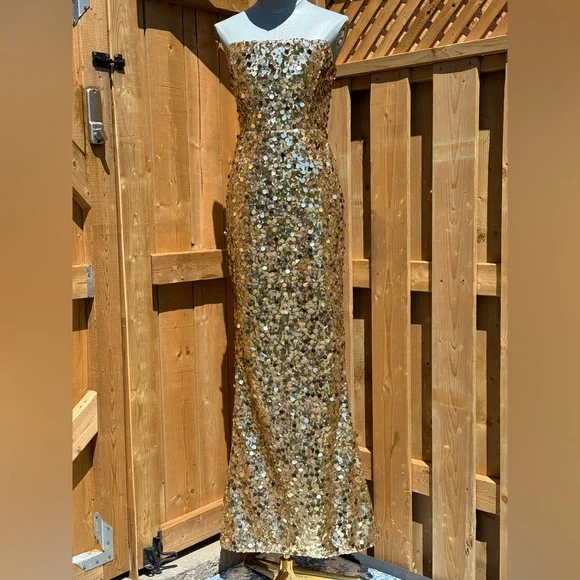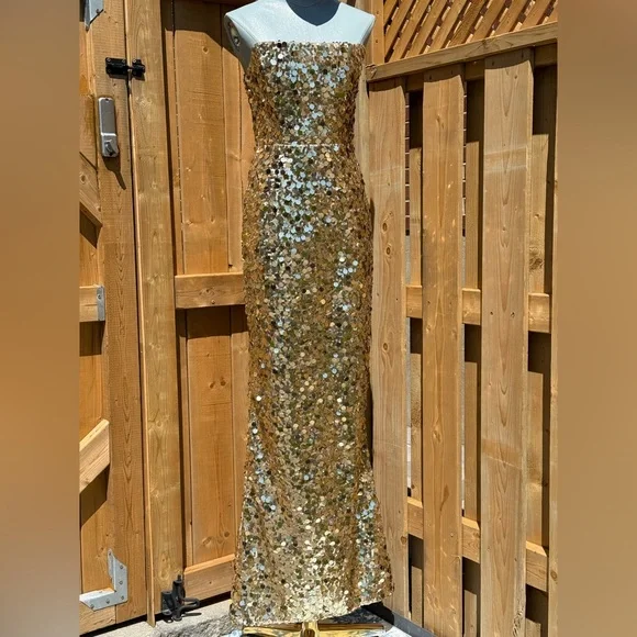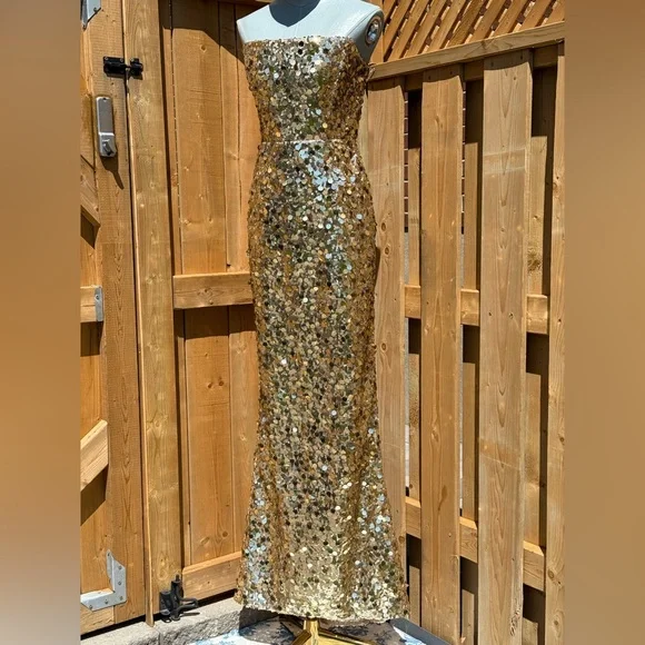 🧿🧿BRONX & BANCO Farah Strapless Sequins GownDazzle in Bronx & Banco's Farah Strapless Sequins Gown in Gold, the epitome of glamour and sophistication.Dramatic sequin fabricAllover sequinsTrain at backZipper closurePartially linedCOMPOSITIONShell: 100% PolyesterLining: 95% Polyester, 5% ElastaneSIZESize Small = US 4Approximate Measurements:Bust: 41cm or 16.1inWaist: 34cm or 13.4inHips: 46cm or 18.1in🧿NWOTBrand New, Never WornNo inclusions: no tags.As is (as pictured)MSRP $ 880🧿🧿🧿🧿🧿🧿🧿ALL OUR ITEMS ARE AUTHENTIC. We are a shopping collective of friends working in the fashion industry around the world, based in Toronto 🧿 Check out our closet for more great finds to bundle and save!Every attempt is made to describe and capture our items as best and as accurately as possible, taking note of any possible flaws. Ultimately, please refer to all photos for overall condition. Please feel free to ask questions or request more photos.We film all of the packaging of our items on video, to capture how items were packed and their condition upon leaving our hands.Follow us on IG @the.procuressHappy shopping,The Procuress🧿