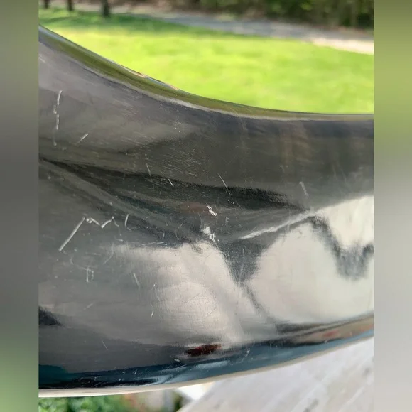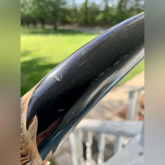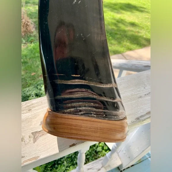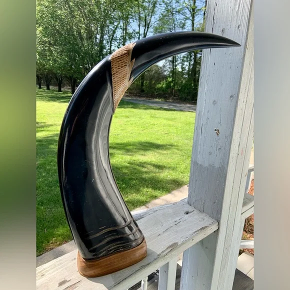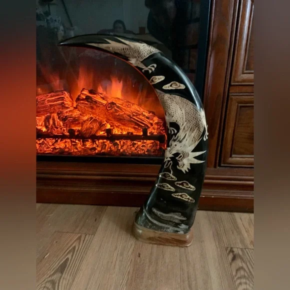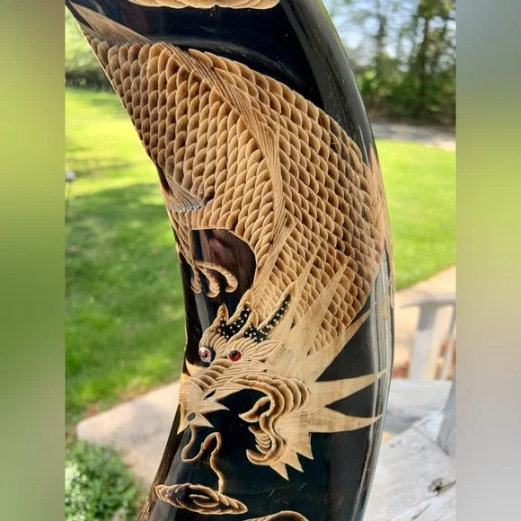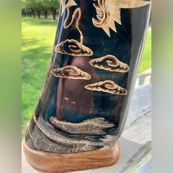 Gorgeous hand carved water buffalo horn. Large, 17 1/2” tall, 12 1/2” long (from pointed tip to the furthest point of the base ).Wooden base is 5 1/2” long x 3 1/2” wide. Horn is carved with an exquisitely detailed dragon. There are some small scratches that have occurred over the years (please see photos) but the do not detract from the exotic beauty of this piece.