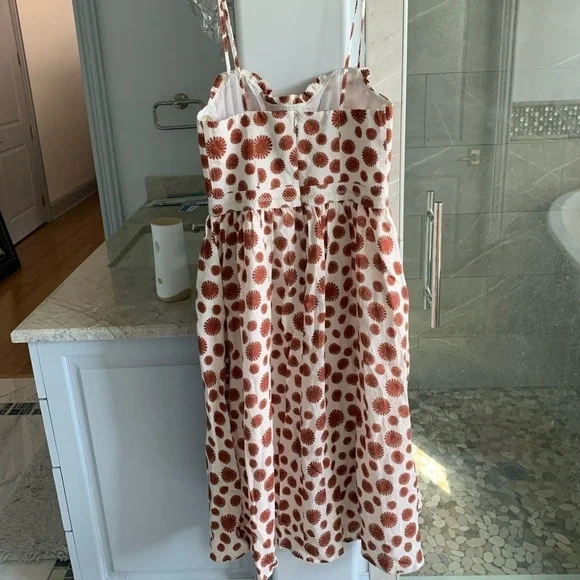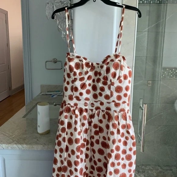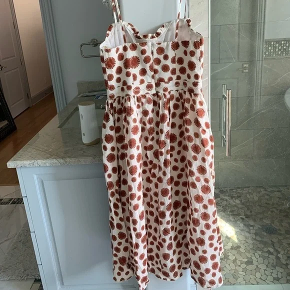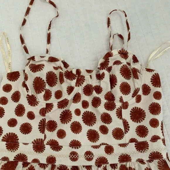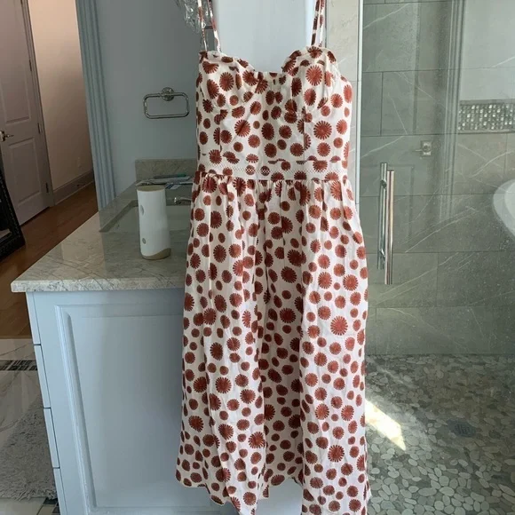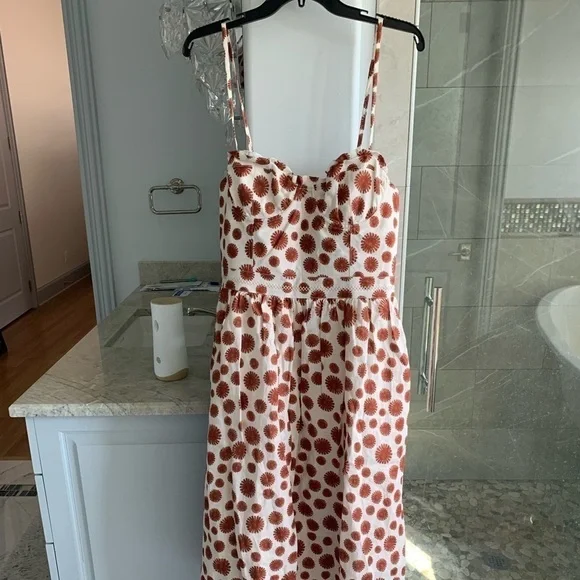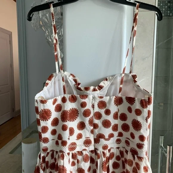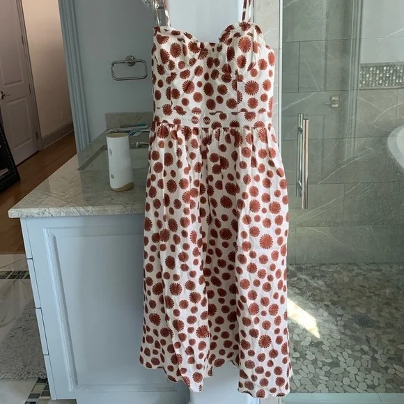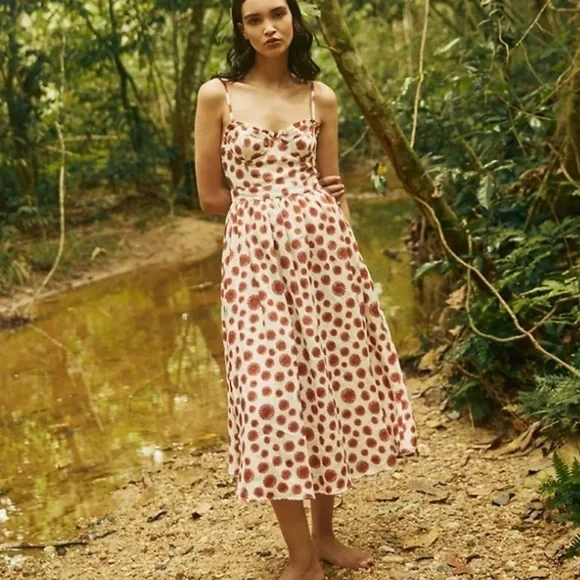 Sunburst motif midi dress with a beautifully tailored busiter bodice, complete with supportive underwire.Ruffled sweetheartneck with underwireSpaghetti strapsFlared skirtWaist slip pocketsConcealed fastening along backLinenDry cleanMeasurements Waist across 16” Pit to pit 17”About 47.5" from shoulder to hem Color: White Red
