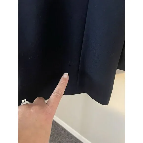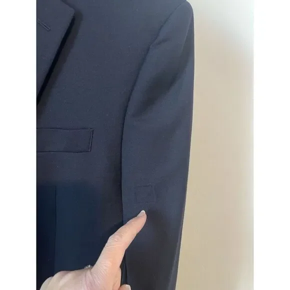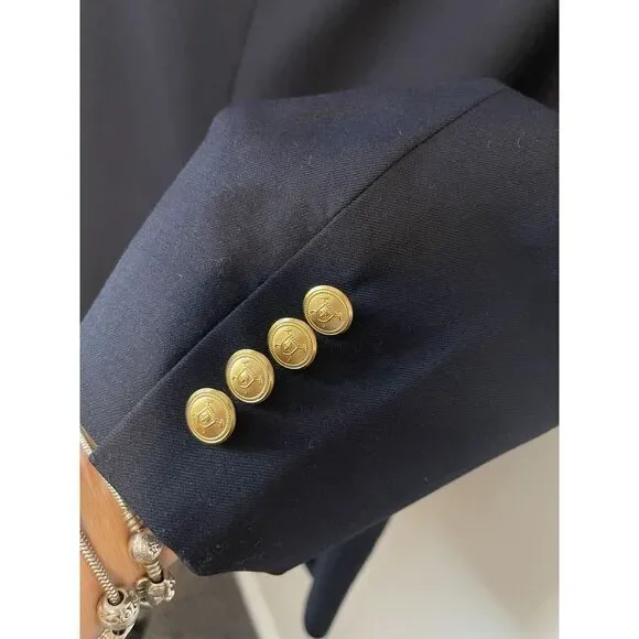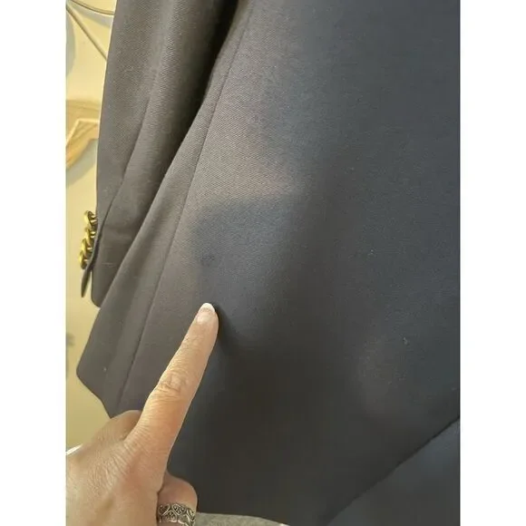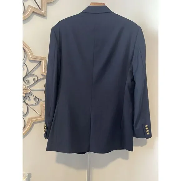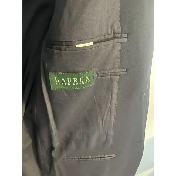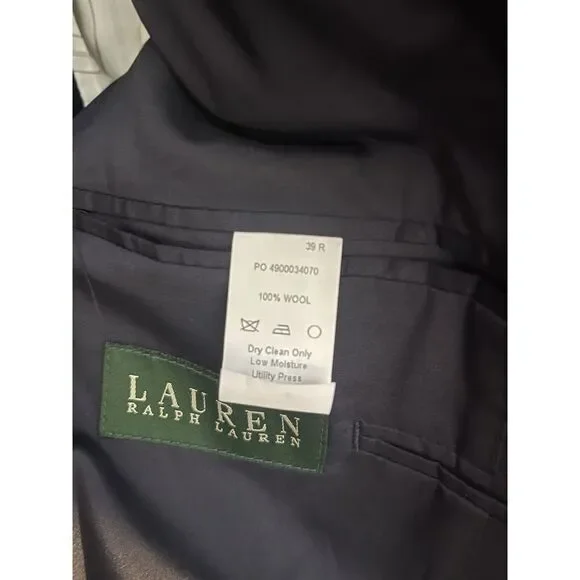 Flaws-label missing on left sleeveBack lower left has signs of a dark stainBack lower right has a snag. Please see all pictures. Thanks.This Lauren Ralph Lauren blazer sport coat jacket is designed for men in size 39R. Made from 100% wool in a navy blue color with gold accents, it features a four-button sleeve style, single-vented jacket with a two-button front closure and notch lapel. The sportcoat offers total comfort with inner pockets and a regular fit, suitable for various occasions such as travel, weddings, parties, business, or casual wear. This classic piece has a designer theme and is a timeless addition to any man's wardrobe.