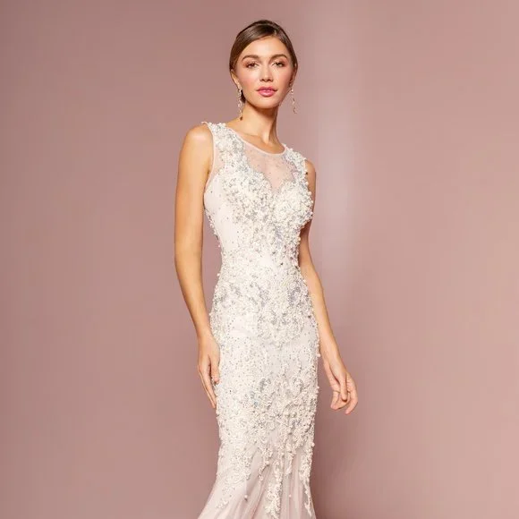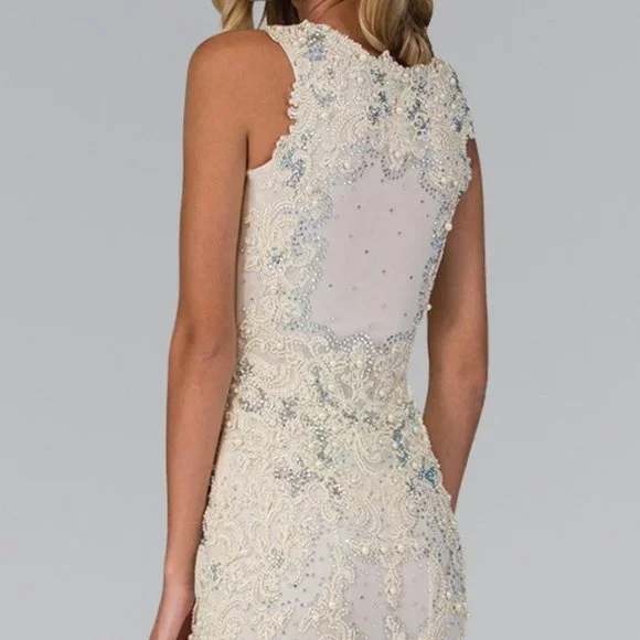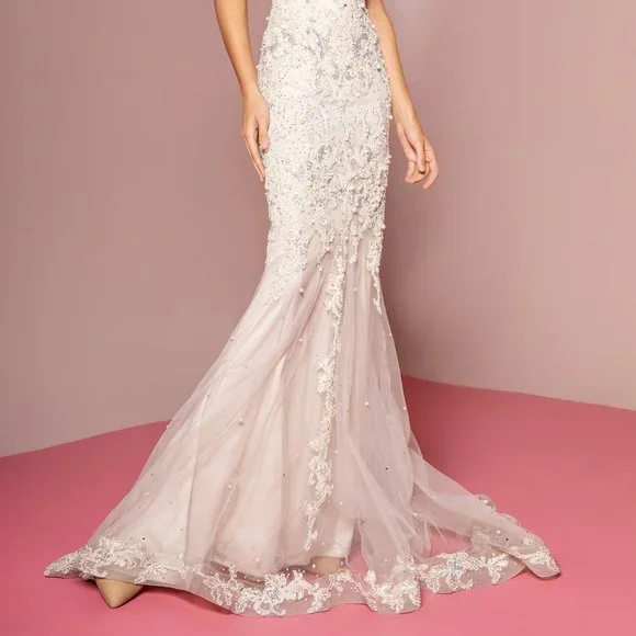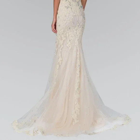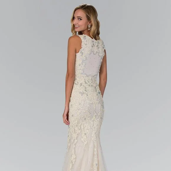 The elegant dress made of tulle has a delicate top decorated with delicate beads that together with rhinestones create a glamorous image.Fabric: TulleLength: LongColour: IvoryNeckline: Illusion scoop neckSilhouette: MermaidSleeve: SleevelessBack: Covered, zipperSkirt: TrainEmbellishments: Beads, rhinestonesOccasion: WeddingTAGS: ILLUSION SCOOP COVERED BACK DRESS, LONG MERMIAD DRESS, PLUS SIZE PROM DRESS, SLEEVELESS EVENING DRESS FOR SPECIAL OCCASION, HOLIDAYS, WEEKENDS, PARTY, BRIDESMAID WEDDING, MODERN DRESS, SUPERB, CHIC, FESTIVE, EVENING, GORGEOUS DRESS, FLOOR LENGTH SKIRT WITH SLIT, LONG PROM DRESS, GLAMOROUS DRESS, SWEETHEART BUSTLINE, EMBELLISHED DRESS, A DELIGHTFUL DRESS FOR FORMAL OCCASION