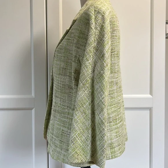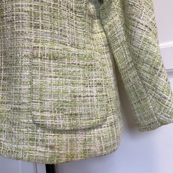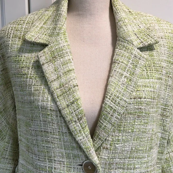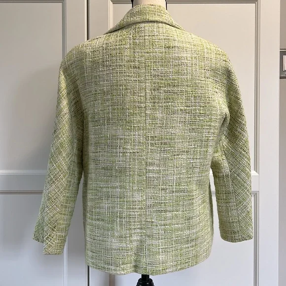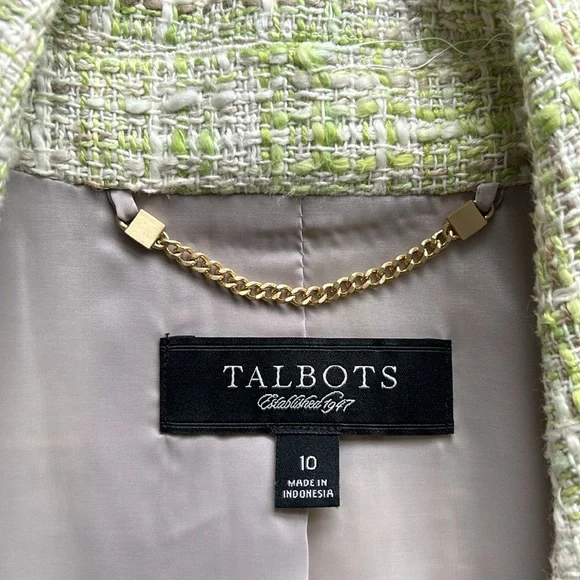 NWOT Talbots Collection Tweed Blazer in Celery Green, Tan & Off WhiteThis well made blazer is a classic nubby woven tweed in pretty shades of celery green, tan & off white. Perfect for spring and summer. Fully lined.NWOT, never worn! Perfect dressed up, with jeans, or heading to work!Thin shoulder pads for a tailored look, one button close.Approx Measures Lying Flat: Armpit to Armpit: 22” Sleeves from neck: 25”Length: 24”* reasonable offers welcome * smoke free home* top rated seller & quick shipping