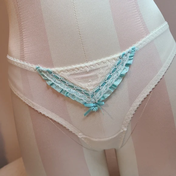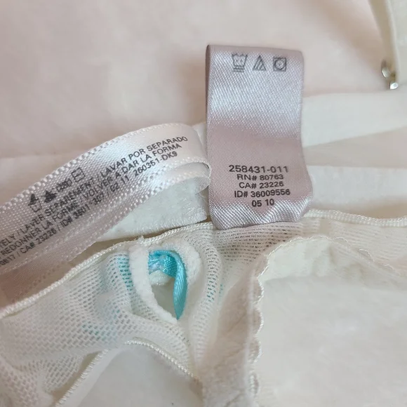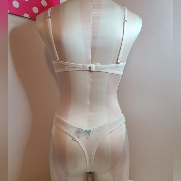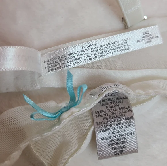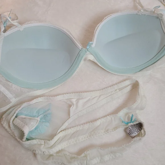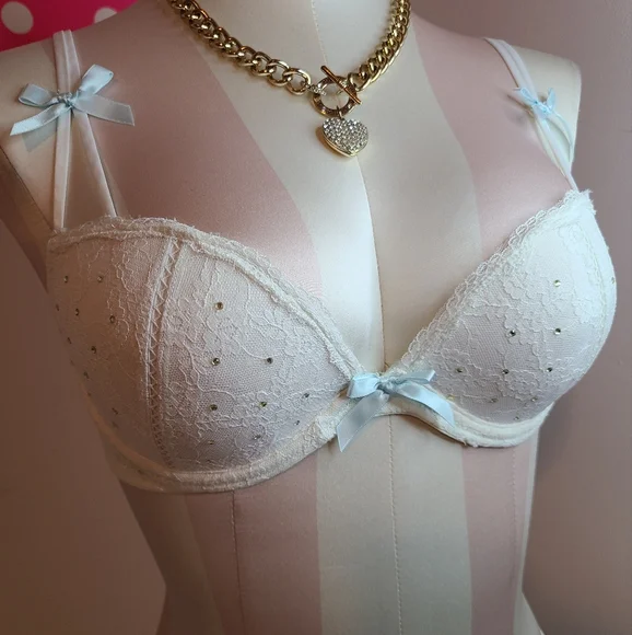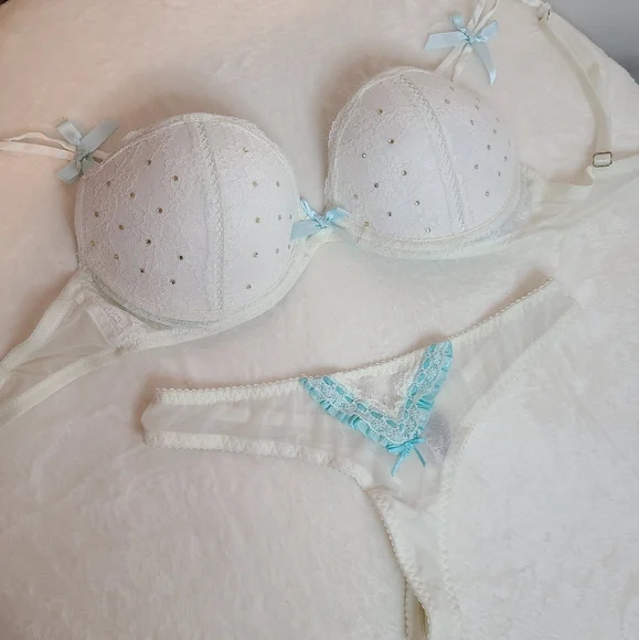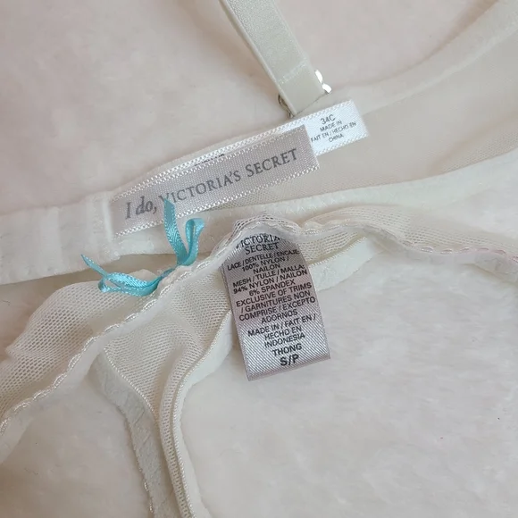 Victoria's Secret ~ Y2K I Do BridalRhinestone Lace bra & panty setUnderwire push-up bra, with rhinestones & baby blue satin bows, hook & eye back closure matching full cut thong panty☆ Rare, Retired - Collectors Item ☆Color: White/ BlueSize: 34C - Small Production: 2010-11Fabric: Nylon, SpandexCondition: Excellent, no flaws*selling cheaper since they are not an exact perfect match - still works thoCheck out my closet for much more Victoria's Secret & PINK - Plus other unique vintage lingerie & panties! $$$ BUNDLE FOR DISCOUNTS $$$