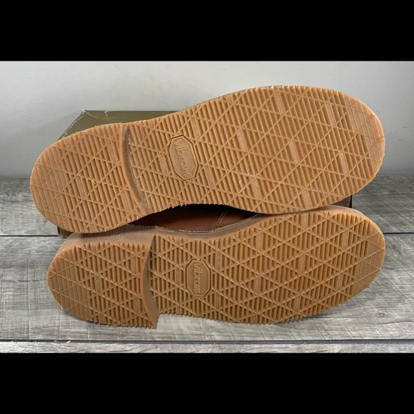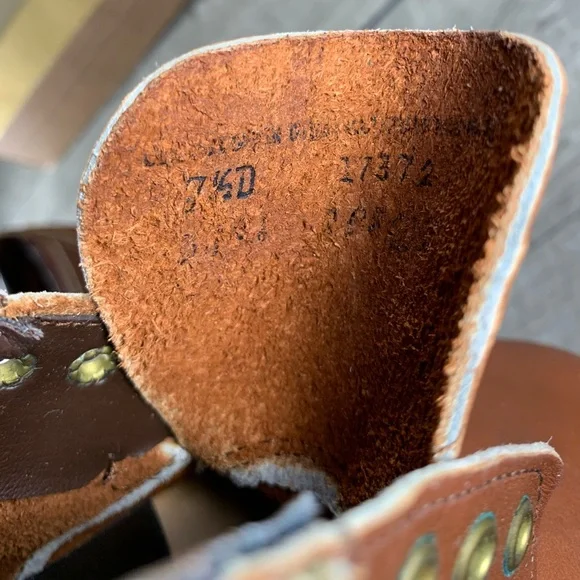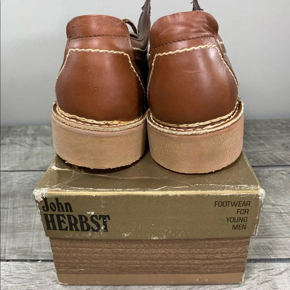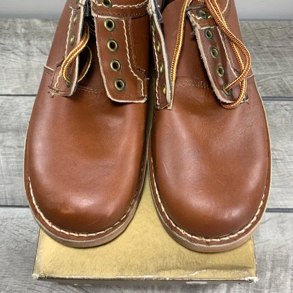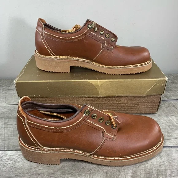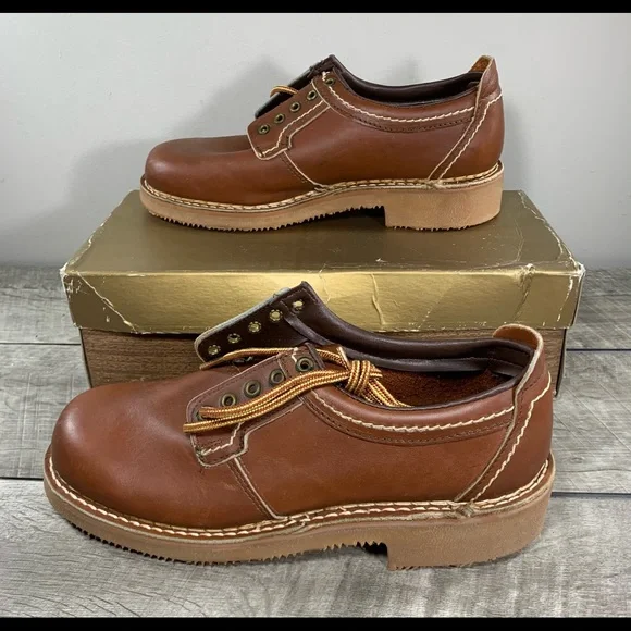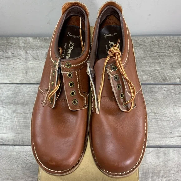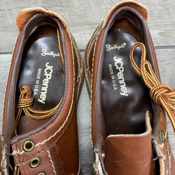 Up for sale is a pair of New Old Stock JCPenney Vintage Men's Leather Working Work Lace Up Soft Toe Shoes. Made in USA! Size 7.5 D, medium. Leather uppers. Rubber soles. From smoke-free home! Clean inside and out. Approximate Outside Dimensions: 11.25 inches heel to toe by 4 inches across the ball of footwear by 4.5 inches tall by 1.25 inches tall heel by 10.25 inches inside heel to toe. Some oxidation around eyelets due to age.