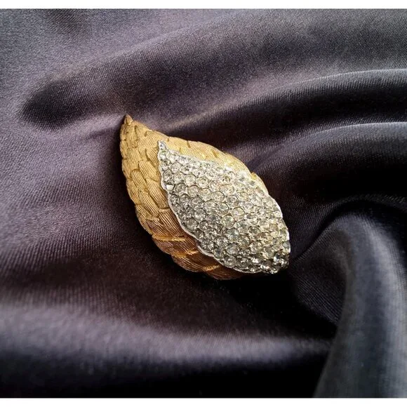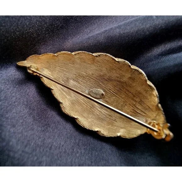 Crafted in radiant gold-tone metal, this brooch is designed in the shape of a bold, textured leaf, giving it a natural and elegant appeal. The intricate detailing of the leaf veins adds depth and dimension to the piece. Accented with sparkling clear crystals that gracefully line the design, this brooch exudes timeless glamour and sophistication. Signed “Benedikt NY” on the back, this piece is a rare find and perfect for vintage jewelry collectors or anyone looking for a standout accessory.