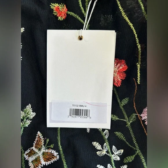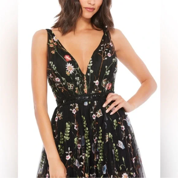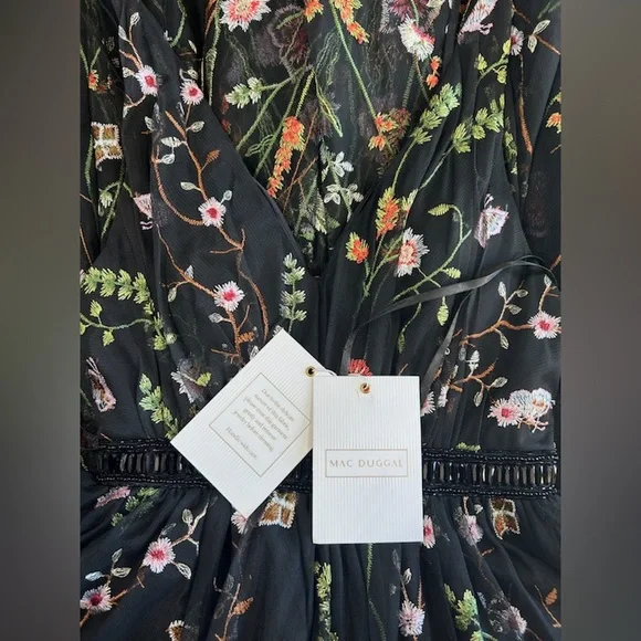 New with tags.Floral embroidered mesh gown with a plunging neckline and v-cut back. Partially Lined. Bust Pads. Back Zipper. 100% Polyester.Tags: homecoming, pageant, date night, holiday party, gala, wedding guest, military ball, photoshoot, engagement pictures, old Hollywood, red carpet, formal, evening gown, elegant, New Year’s Eve, nye, army ball, marine ball, classy dress, black tie, charity event, guest of wedding, prom, quinceanera, special occasion, mother of the bridePlease note due to the intricate nature of the gown, it's possible there could be a slight flaw (loose string, missing bead or sequin, etc.) After close review, I'm not finding anything major.