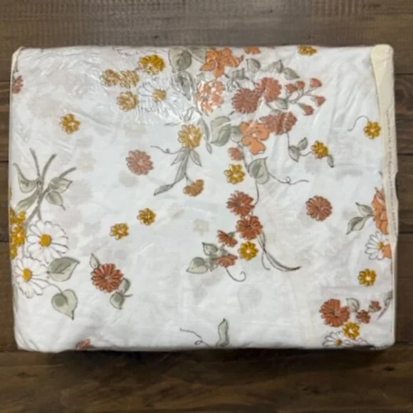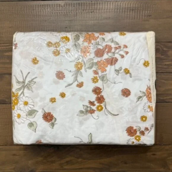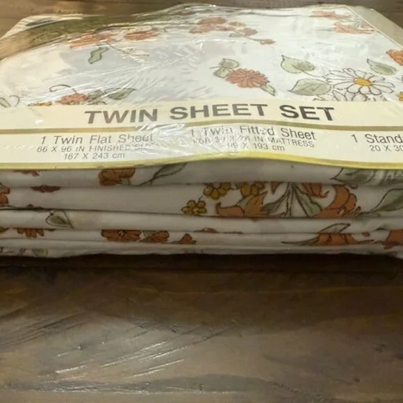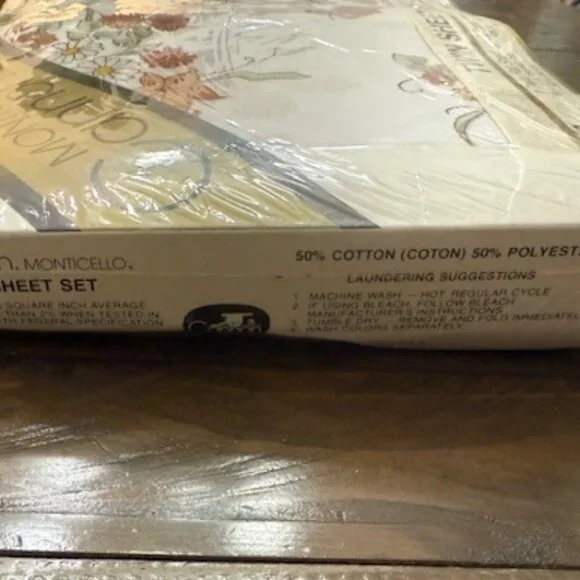 Cannon Monticello 3 Piece Twin Sheet Set Floral Cottagecore 180 Thread Count NOSAdd a touch of timeless charm to your bedroom with this vintage Cannon 3-piece twin sheet set, still sealed in original packaging. Featuring a white background adorned with white and orange flowers, this set exudes classic cottagecore style. Made from durable no-iron percale, it's both beautiful and easy to care for.Includes 1 twin flat sheet, 1 twin fitted sheet, 1 standard pillowcase50% Cotton, 50% polyesterSee label for measurementsMade in USANew old stock - package may show signs of wear from storage