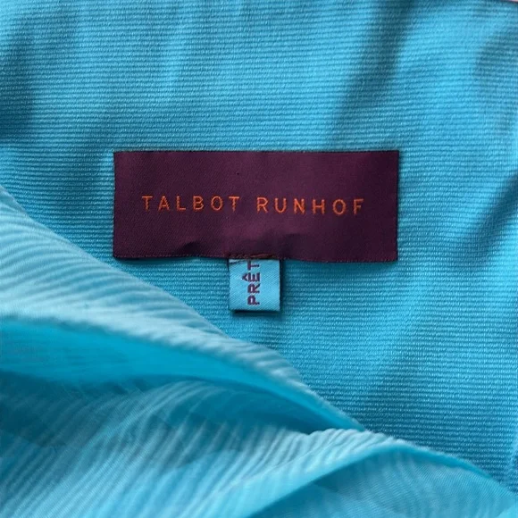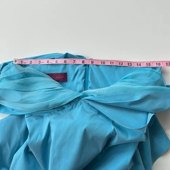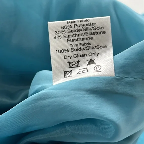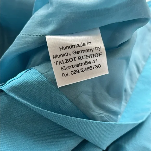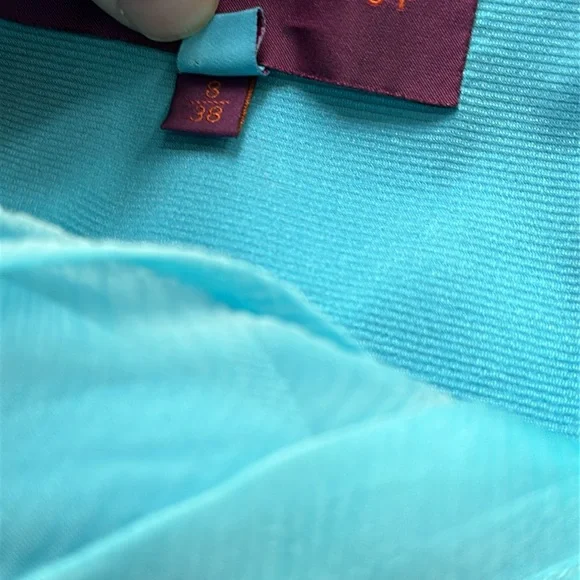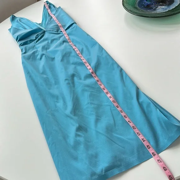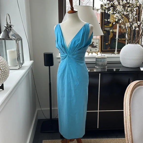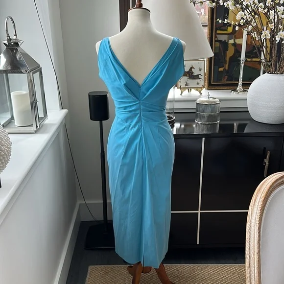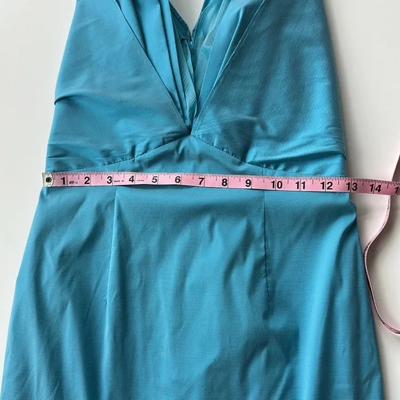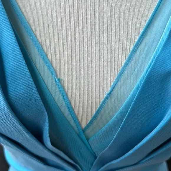 Hand made, glamorous dress with multilayered deep v-neck, empire waist and 11.5” slit in the back. Featherweight fabric in aqua. Very in keeping with the feminine, glamorous trends of the moment. Very good condition. It looks like it was tacked in the front and the stitch didn’t hold, see photo. Otherwise, just needs a good steaming!Made in GermanySize 8