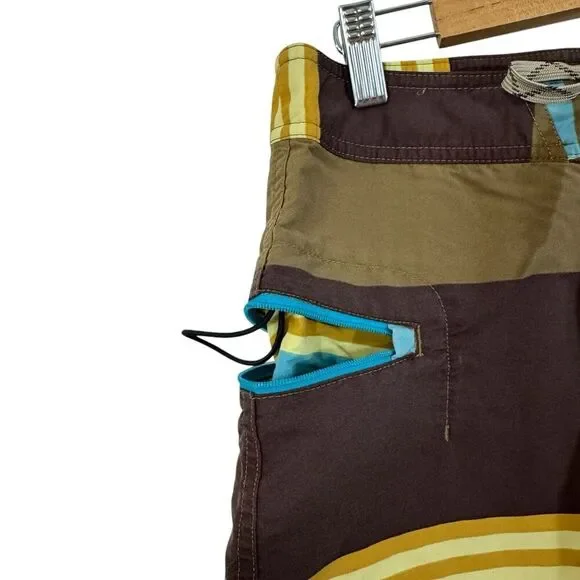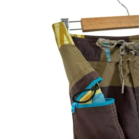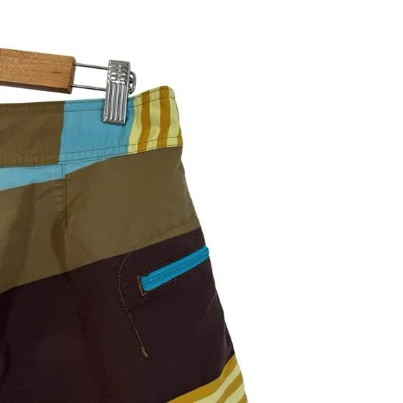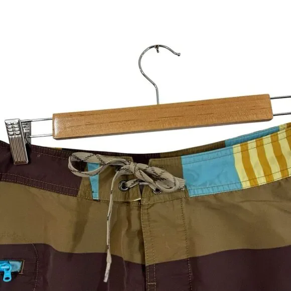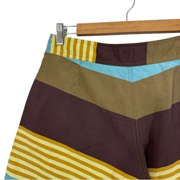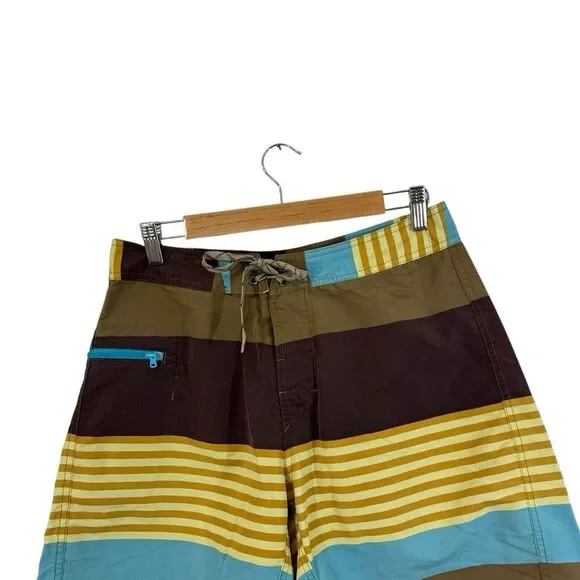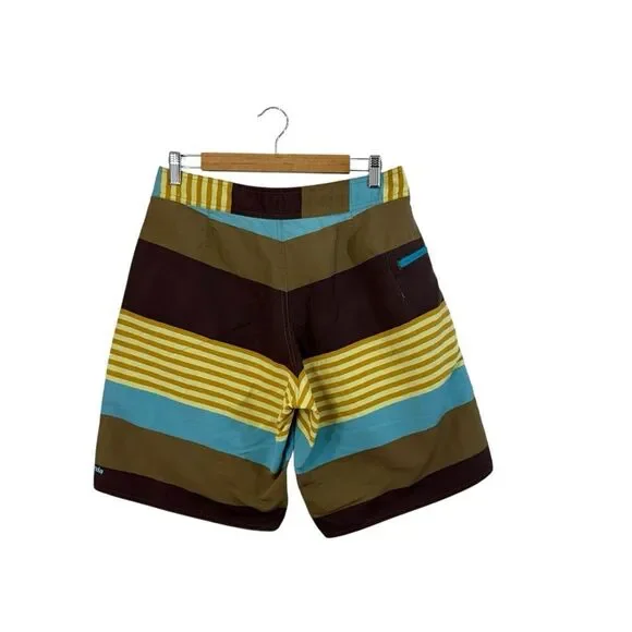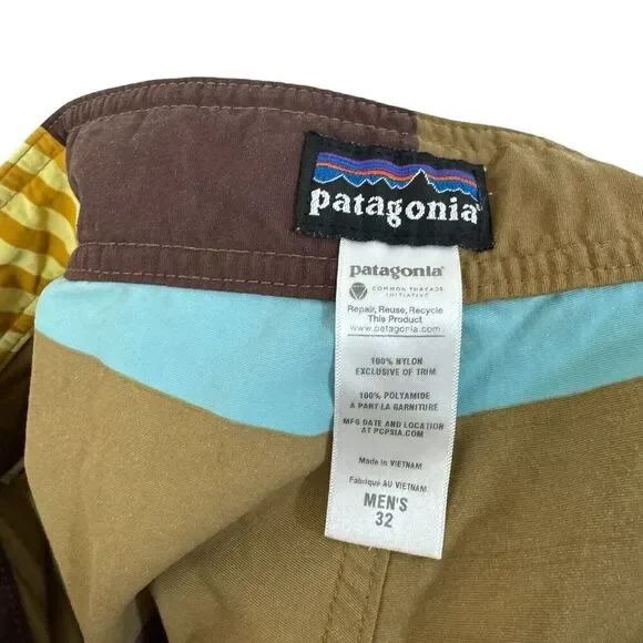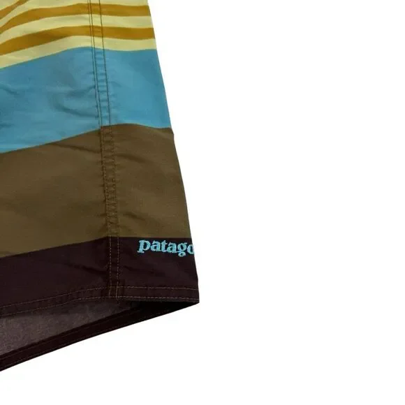 Patagonia 32 Wavefarer Board Shorts Swim Tie/Button Closure Striped Beach Mens Nylon LightweightGood Gently Used Pre-Owned Condition! *****The shorts have loose threading on the back in one section and light fabric wear in one small section on the back - Please view/zoom in on all close-up pictures for details - No major wear or flaws!Measurements (measurements were taken with garment laying flat & are approximate):top to bottom: 19"leg inseam: 10"rise: 11"waist: 16"