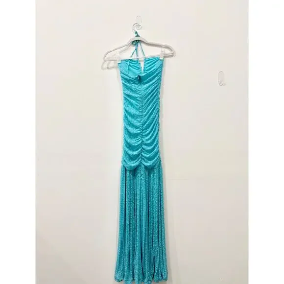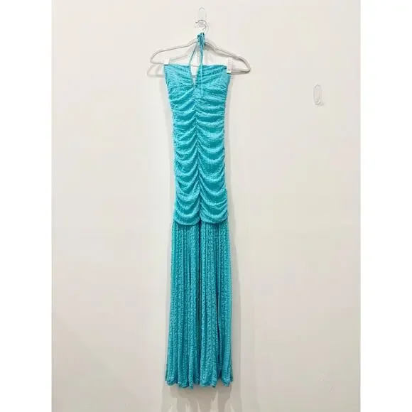 Ganni Sleeveless Halter Ruched Mermaid Maxi Dress Blue Curacao Womens 34/US 2-4Item condition: brand new with tags Measurement:pit to pit 14'' very stretchywaist 10'' very stretchylength 55''Brand:GanniSize: 34, US 2-4 stretch Color: Blue CuracaoSleevelessHalter necklineMaxi lengthRuched Hidden back zipper closure.Mermaid skirtDrop-waist bodiceBody-hugging97%polyamide, 3%elastaneDry clean only.Pair with strappy metallic heels and a sleek clutch for a dramatic evening look. Perfect for weddings, galas, or evening soirées.girly, feminine, modern, classy, classic, timeless, romantic, fall, party, minimalist, elegant, chic, date night, night out, dinner date, y2k, cocktail, modest, mature, maxi dress, formal, mermaid, halter5 star. seller - 5.000+ items sold - Fast shipping - Closets of influencers and fashion collectors-Shop with confidence - Smoke-free clean storage environment -Bundle and Save! - New arrivals every week