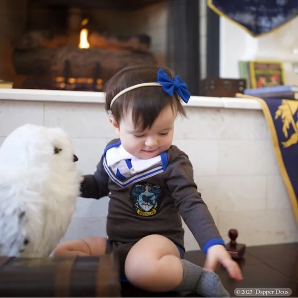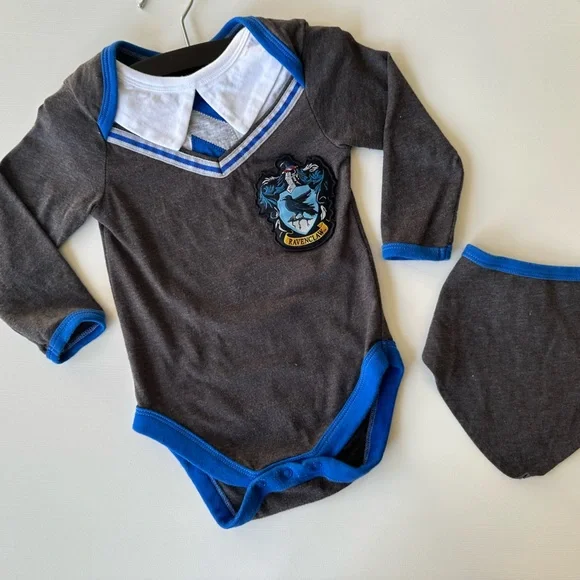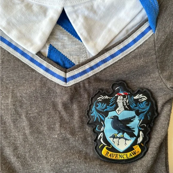 From the UK collection this Harry Potter Official Ravenclaw Dress Up Babygrow is an all in one babygrow designed to look like separate items of clothing. Comfortable enough for every day life or the perfect Halloween costume for your little witch or wizard! Condition: Good Used Condition with light wear throughout Details: • Real Collar• Appliqued Tie• Beautifully detailed Ravenclaw coat-of-armsFabric:•100% CottonCare:•Machine WashableWe are a smoke-free and pet-free home. This item has been laundered with Seventh Generation’s Fragrance-Free Free & Clear detergent.