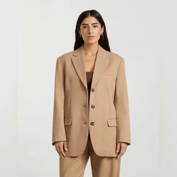 FitOversized fitCustomers say this style runs large. Take a size down for a less oversized look.DescriptionThe elevated essential everyone needs in their wardrobe.The ’80s Blazer is true to tailoring traditions, featuring a classic notch collar, exaggerated shoulders, and a relaxed silhouette with three front pockets—sewn shut to keep the silhouette streamlined, and one interior pocket to keep your most important essentials close at hand. The best part? It looks just as good thrown over a bralette and leggings as it does over denim or smart pants.Material & CareMaterialsShell: 60% TENCEL™ Lyocell, 40% Cotton. Lining: 100% Recycled Polyester. Exclusive of Ornamentation.CareMachine Wash Cold Gentle Cycle. Hang to Dry. Or Dry Clean.DetailsAdditional DetailsMade at Poong In in Vietnam.Shoulder pads3 Exterior pockets1 Interior pocket3-button front closure