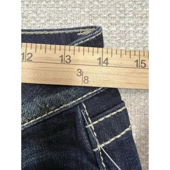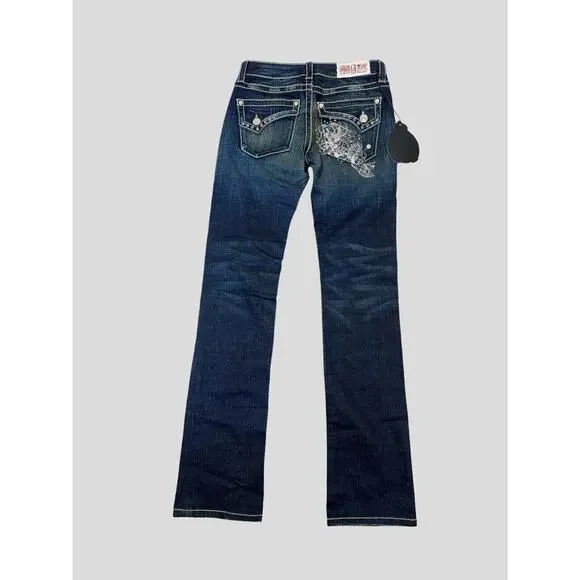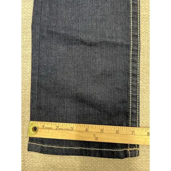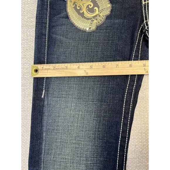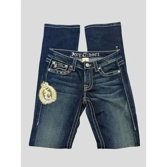 Absolutely gorgeous pair of dark wash denim jeans with strong quality denim, and large bright stitching. Back pocket is adorned with sparkling crystals, rhinestones and studs over what looks like an image in lace. The front pockets and other back pockets are also embellished but more subtle than the one. Also there is some whiskering on the denim and very minor factory distressing. From the KC ART COLLECTION these unique flashy jeans from KEY CLOSET are not seen everyday.Surprisingly they are machine washable and tumble dry low; so easy care.Please see measurements. These jeans are longer than most.MADE in USANWT