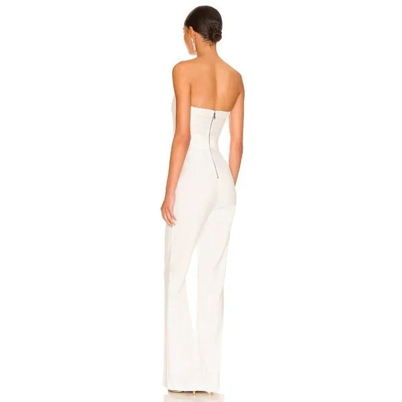 New !Size 8Self: 98% poly, 2% elastaneLining: 94% poly, 6% elastaneMade in ChinaDry clean onlyExposed back zipper closureBoned bodice with non-slip silicone grip lining at necklineBack panel designCrepe fabricNeckline to hem measures approx 52" in length16" at the knee narrows to 12" at the leg openingRevolve Style No. ALI-WC19Manufacturer Style No. CC202A22806812Alice + Olivia Lavera Jumpsuit in Off White Strapless 8 NWT $495