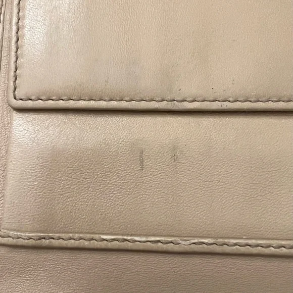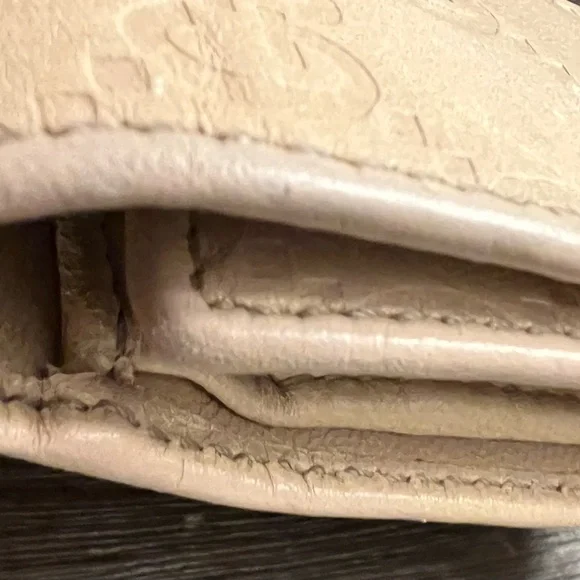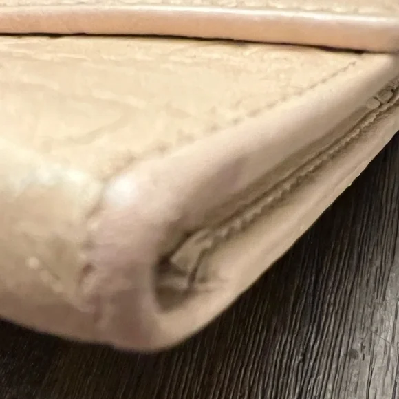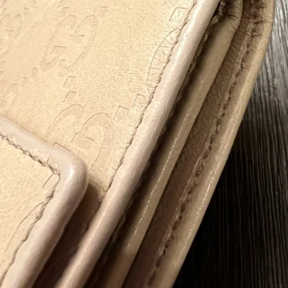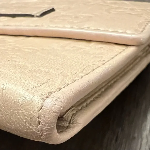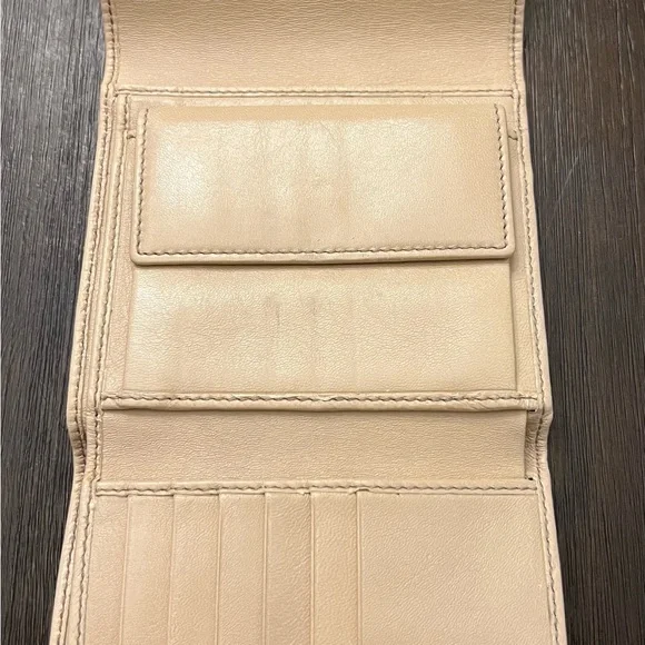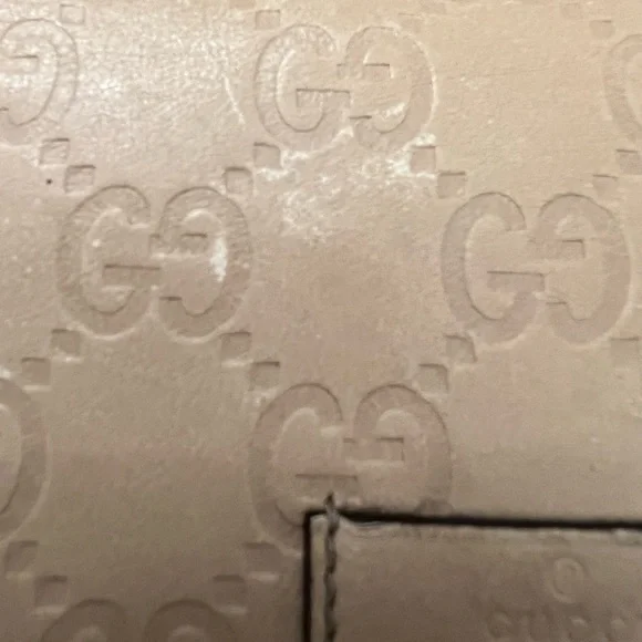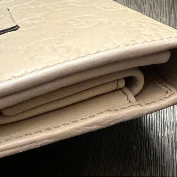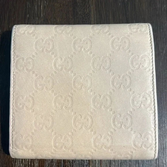 Vintage authentic Gucci GG Logo PVC Leather Beige Trifold Unisex Wallet. Preloved!Color loss of front of wallet, rubbing on corners, and surface wear inside and outside, creases in bend areas from use. Overall, very good used condition.Please see pictures for all details. Sold as-is.Approx: 5in by 4.5 inches.Make an offer!