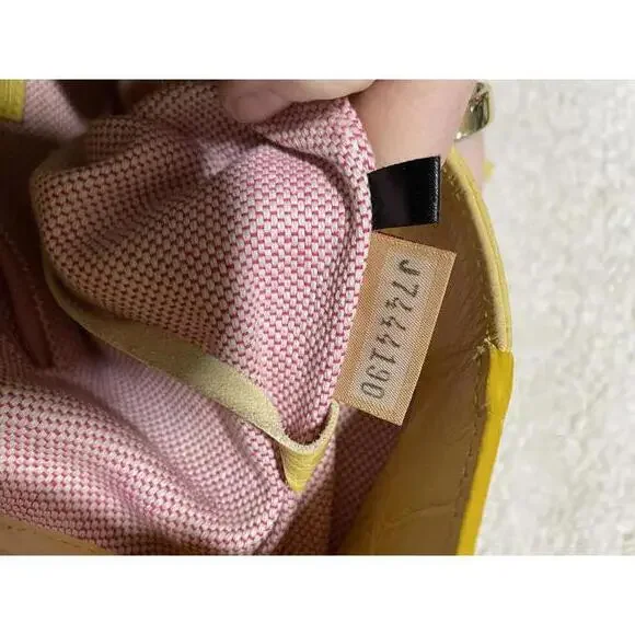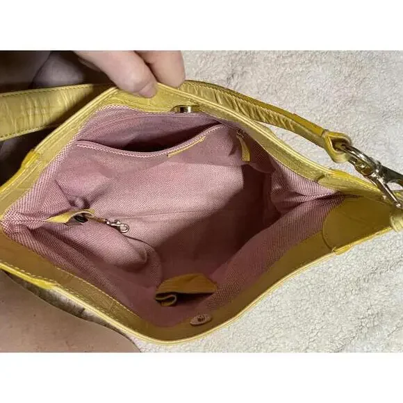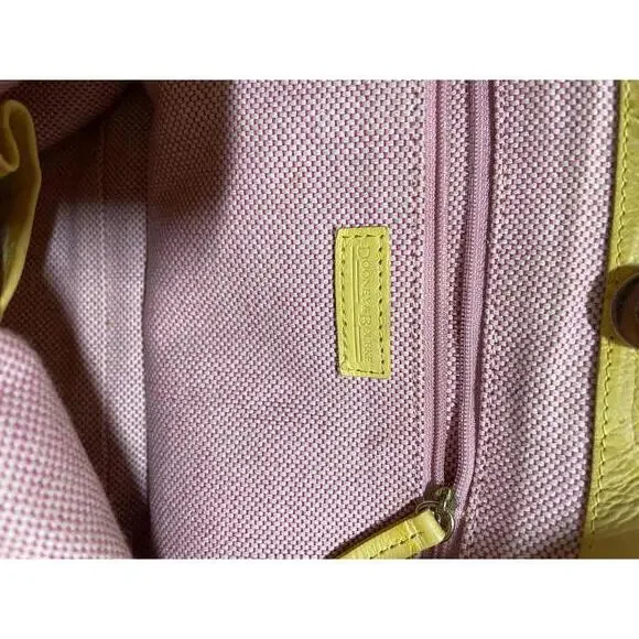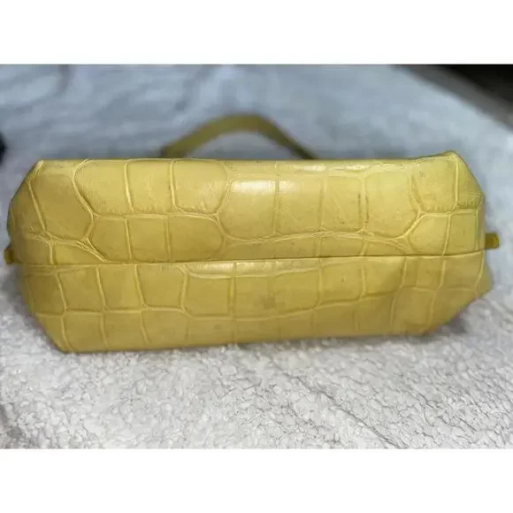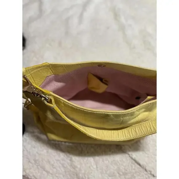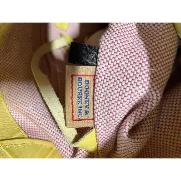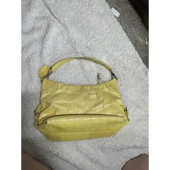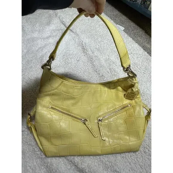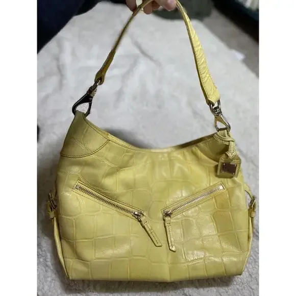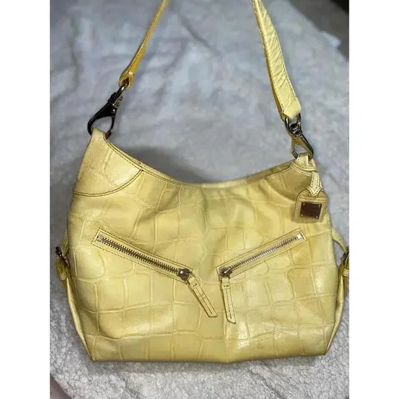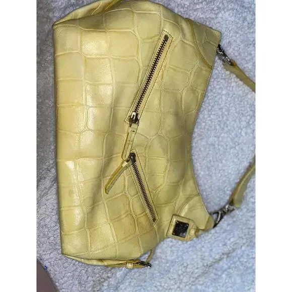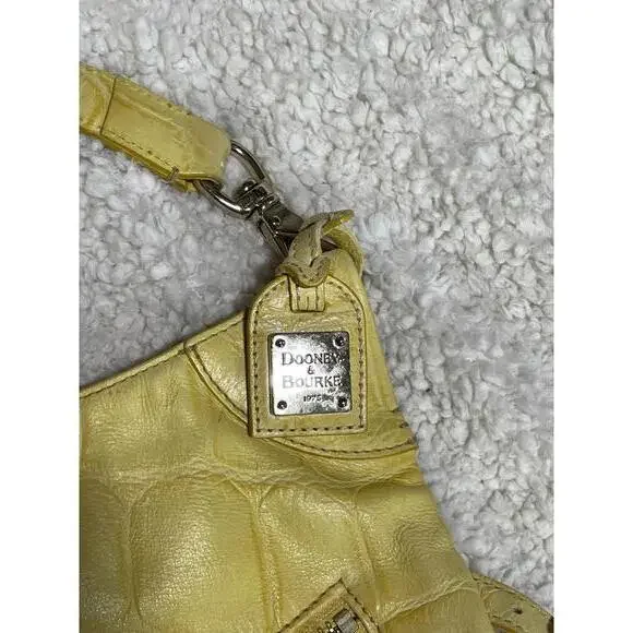 Elevate your style with this stunning Dooney & Bourke handbag, featuring a vibrant yellow crocodile-embossed design. Ideal for everyday use or as a fashion statement, this bag offers both functionality and flair. The spacious interior provides ample room for your essentials, while the sleek, zippered pockets add a touch of sophistication. The structured yet soft handle ensures comfort during wear. Crafted with signature quality, this bag is perfect for any occasion.- Vibrant yellow color- Crocodile embossed texture- Dual zippered front pockets for easy access- Comfortable shoulder strap- Signature Dooney & Bourke branding- there is wear on the bottom corners and a water mark on the side, normal wear and tear