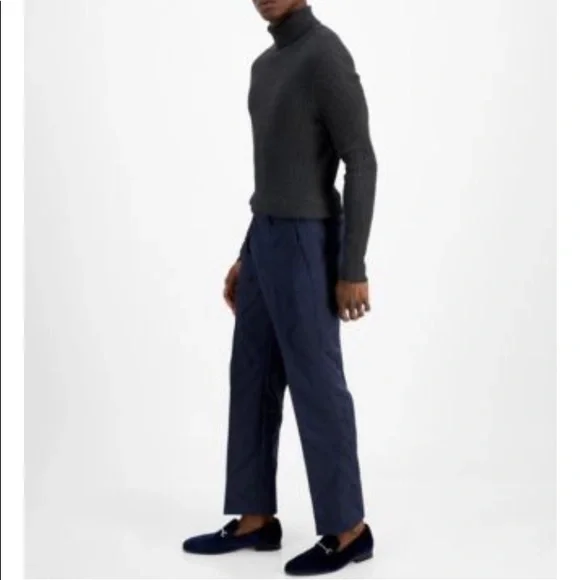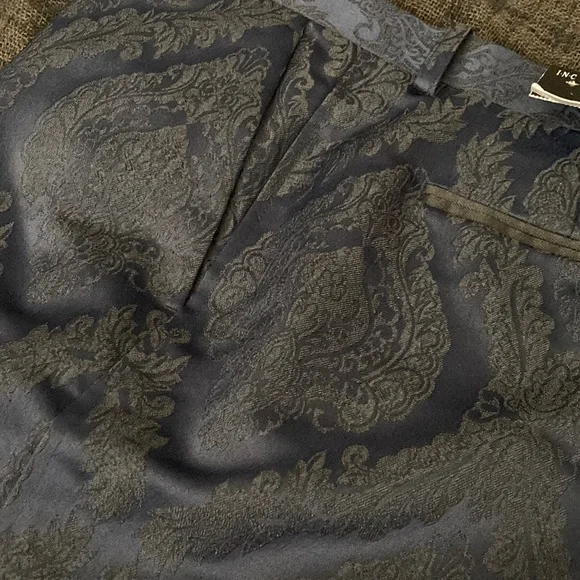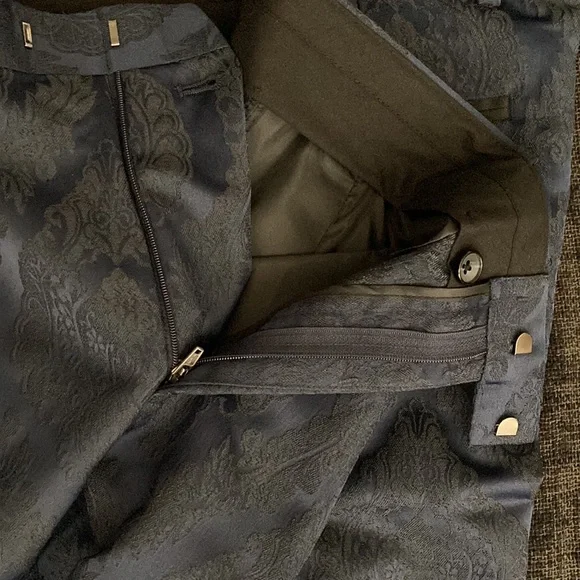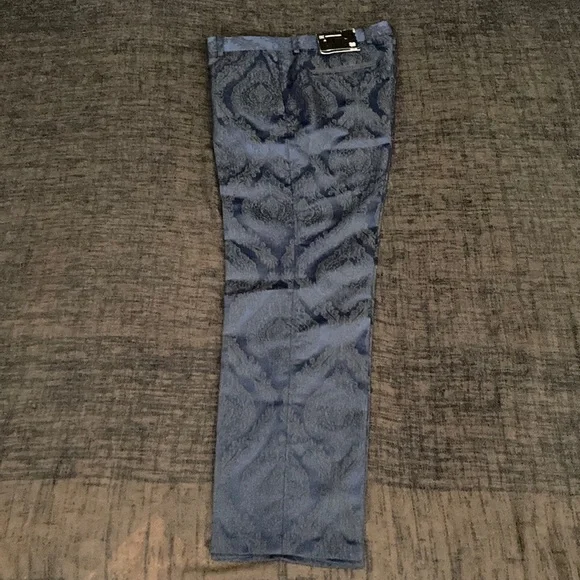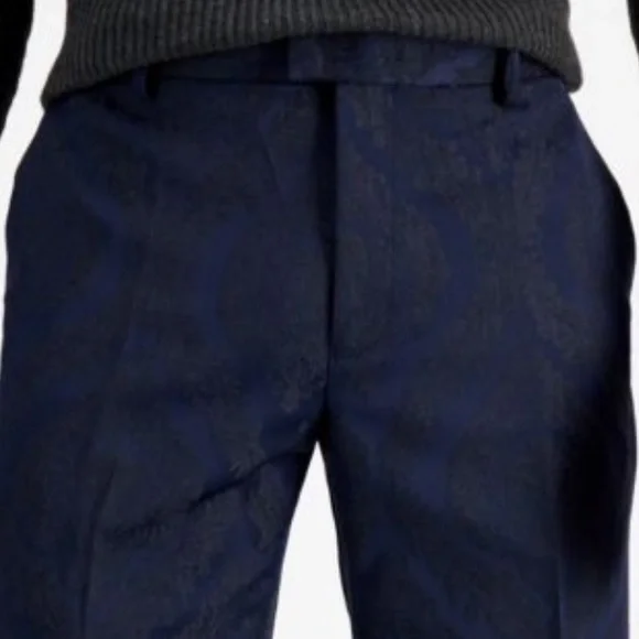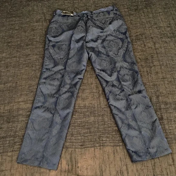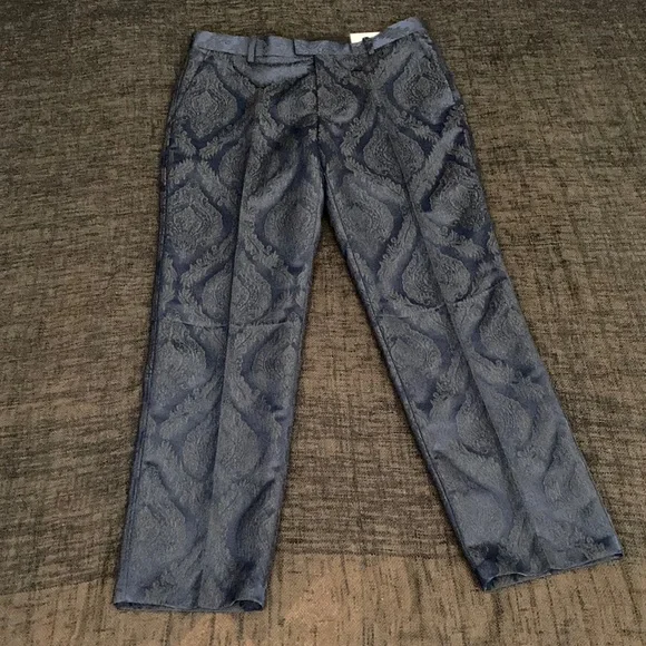INC Men's Slim-Fit Vintage Brocade Jacquard Pant Blue/Black NOTE:Color Closer to Pix 1-3 & Seller’s PixSize 32Slim FitHits at AnkleHandsome Looking PantsTwo Slant Front PocketsZip Fly, Button + Hook ClosureBelt Loops + Two Back PocketsAllover Baroque Acanthus Leaf DetailsSee Last Photo for Size Chart (Actual Item)Flat Measurements (approximate)Rise 10”Inseam 31”Length 40”98% Polyester 2% Spandex Dry Clean