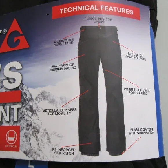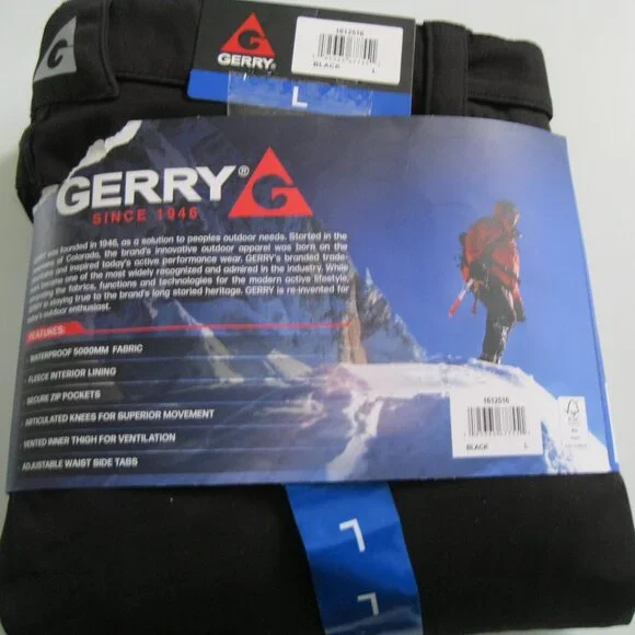 Gerry Men's stretch Snow Pant Fleece Lined waterproof zip pockets Black L (Ling0851) (This one is new but has no tag or package. Photos show package for information only.)Gerry Men's stretch Snow Pant in Black, size L. Fleece lined and waterproof with zip pockets. Designed for winter activities like skiing, featuring a classic style and a straight leg fit. Made of polyester, nylon, and spandex blend for comfort and flexibility. Perfect for outdoor adventures or casual wear.Features:Gridded fleece liningWaterproof 5000MM FabricArticulated knees Re-inforced kick patchInner-thigh vents for coolingSecure zip hand pocketsAdjustable waist tabsElastic gaiters with snap buttonSecure zip pocketsMade in VietnamContent:100% PolyesterHeavyweightSizing: size LColor blackCare Instructions:Machine wash coldTumble dry lowNote: The digital images we display have the most accurate color possible. However, due to differences in computer monitors, there may be variations in color between the actual product and your screen.