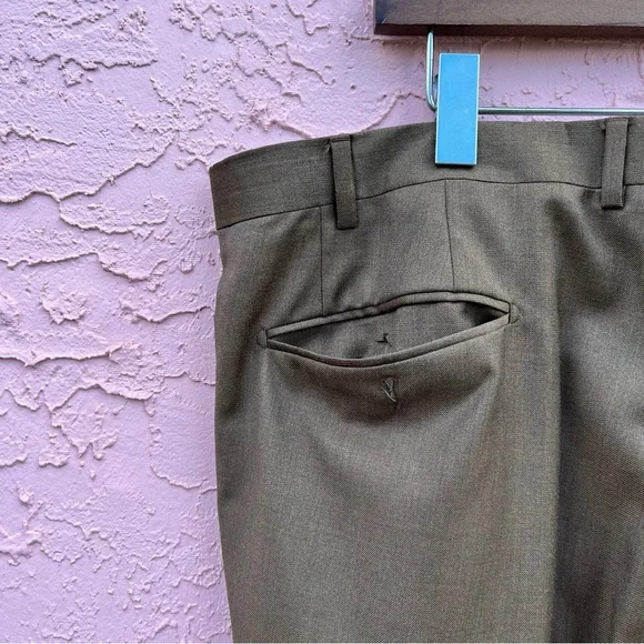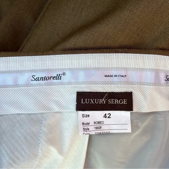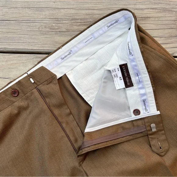 Santorelli Luxury Surge Romeo Virgin Wool Italian Dress Pants Tobacco Size 42Good pre-owned condition…please see all pictures…left rear pocket is missing a button as shown in the pictures..Tag is marked 42Color is TobaccoAll photos taken in natural light Bundle your likes and save on shipping.JFLGWY1024