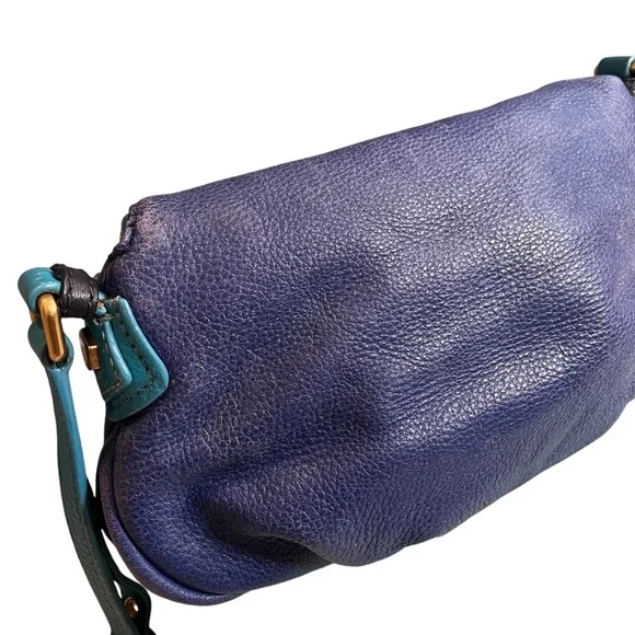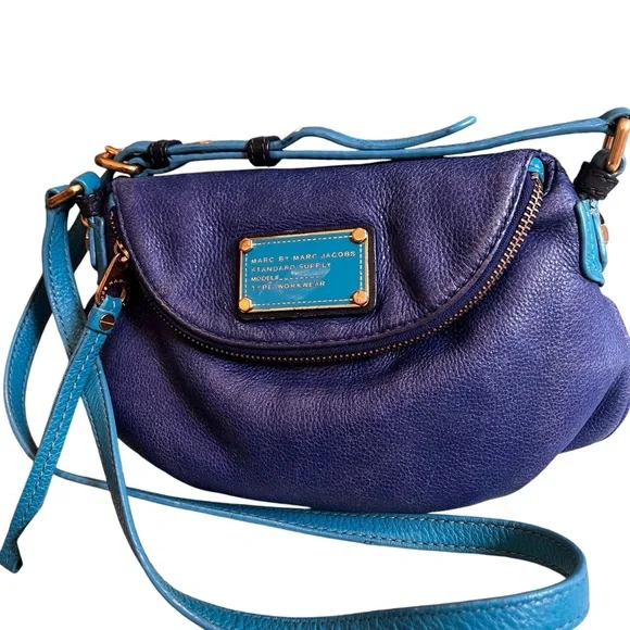 MARC by MARC JACOBS Blue/Teal Mini Natasha Crossbody Bag.This Purse is a stylish accessory for any fashion-conscious woman. Crafted from high-quality leather, it features a blue exterior with gold hardware accents that add a touch of luxury. The crossbody style makes it easy to carry around while keeping your hands free, and its compact size is perfect for storing your essentials on the go. Whether you're heading to work or out for a night on the town, this bag is sure to become your go-to choice. The flap offers a fairly large pocket that is separate from the main compartment of the handbag. Within the main compartment you will find a zipper pocket opposite two open pockets.11” w x 7” H x 2” D, adjustable strapPre-owned, fair condition because the bag has color loss as shown in the photos from use over time