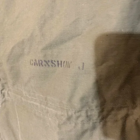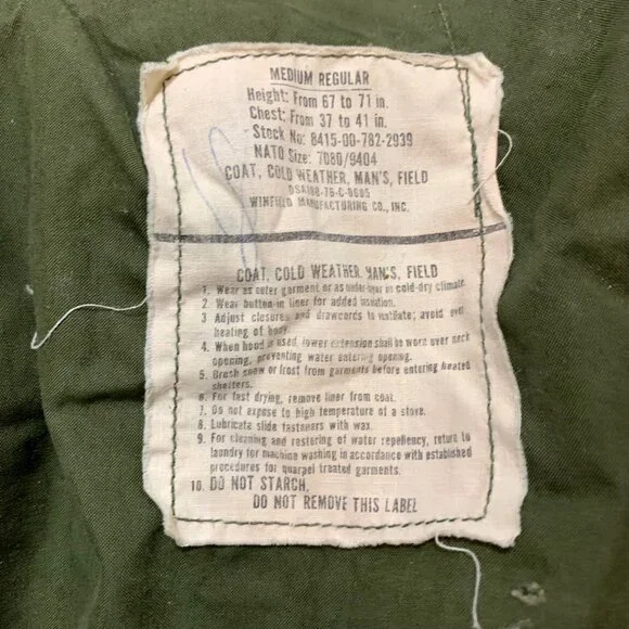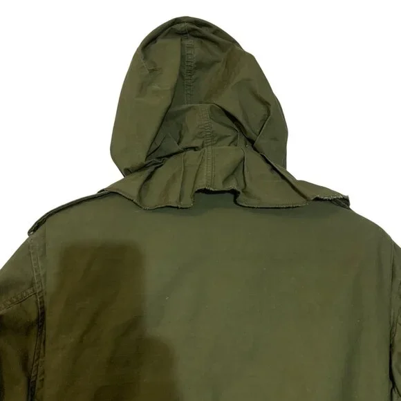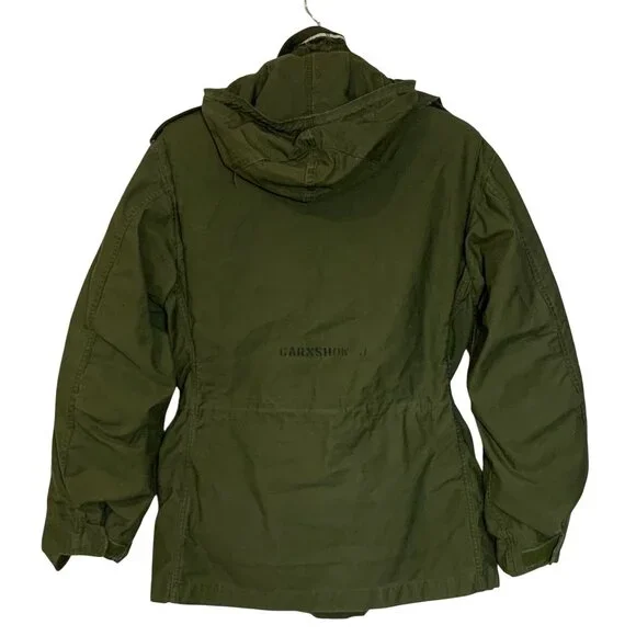 This M-65 field jacket is crafted for cold weather, offering durability and functionality. Designed for military use, it’s perfect for outdoor ventures and chilly climates.• Medium Regular size• Durable olive green cotton-nylon blend• Removable hood with drawstring closure• Four secure flap front pockets for storage• Snap button and zipper front closureSome light wear and spot on front right hemline, as shown in photos. Faint lettering on the back reads "Carnshow, J". Label indicates height: 67-71 inches and chest: 37-41 inches. Shoulder to shoulder: 20", Armpit to armpit: 23", Sleeve length: 23.5", Top to bottom: 30".Size: Mens MCondition: Pre-Owned
