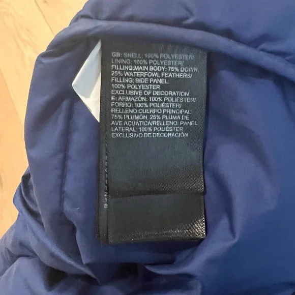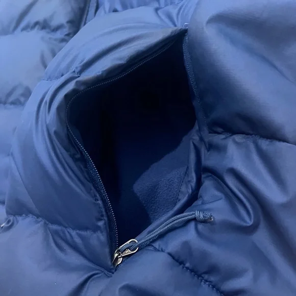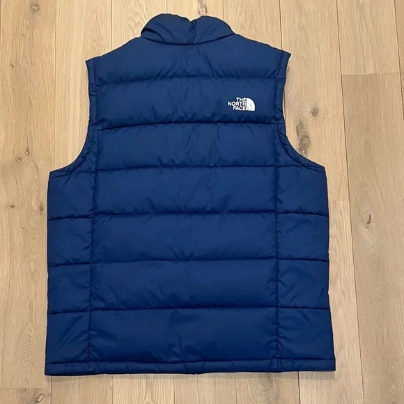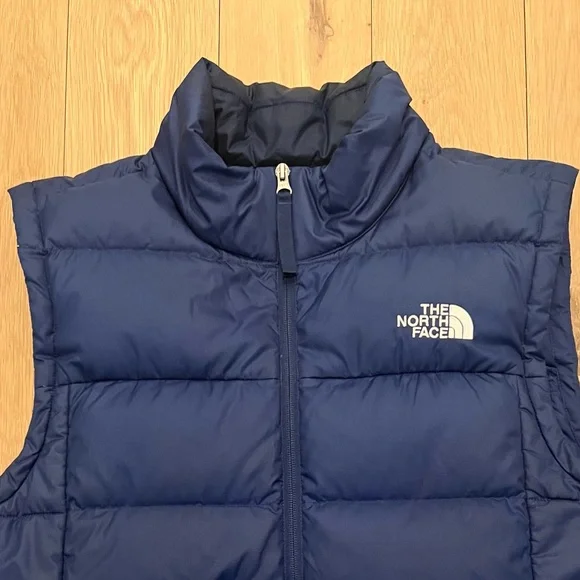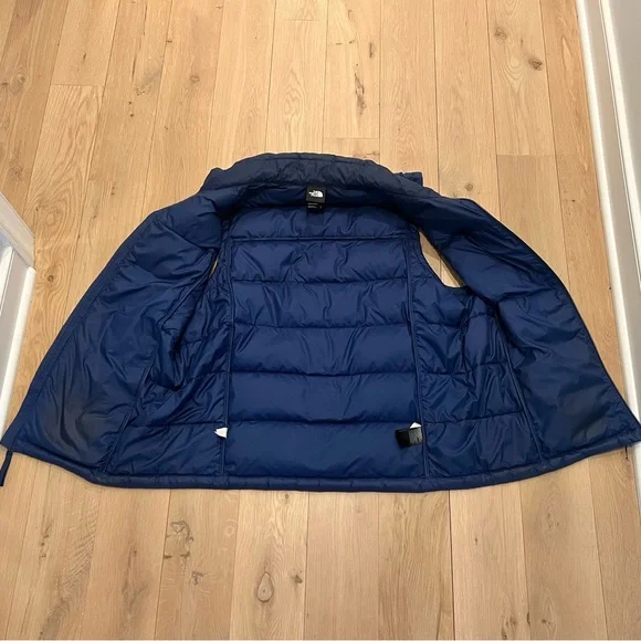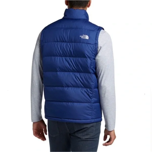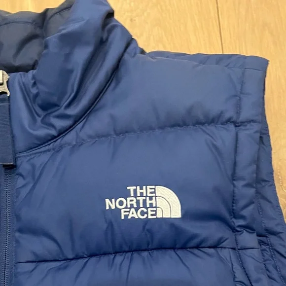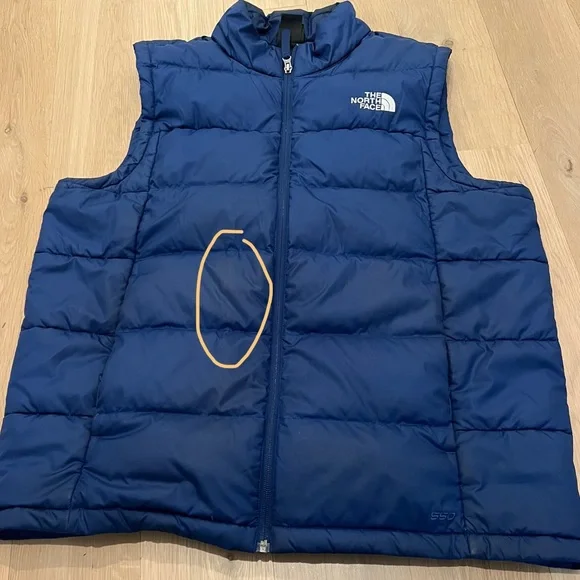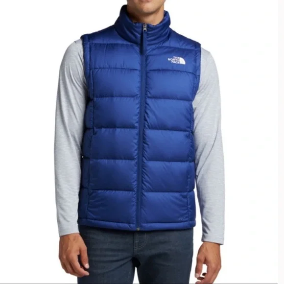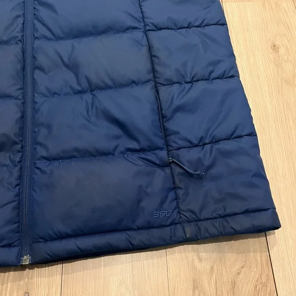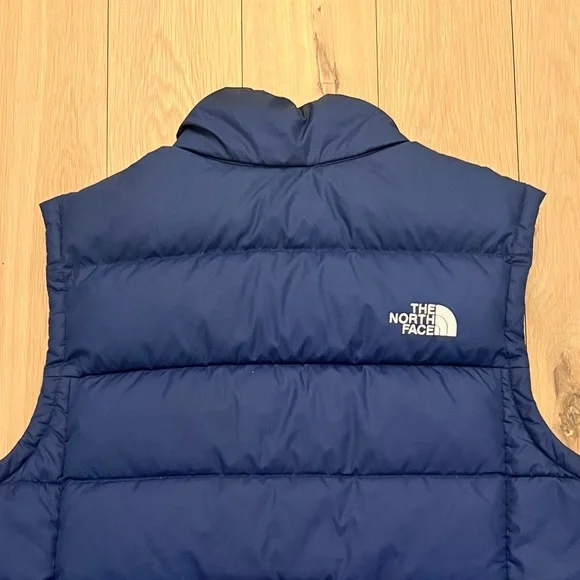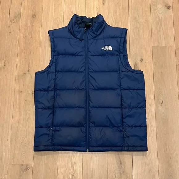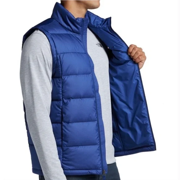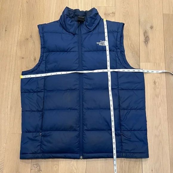 The North Face Alpz 2.0 Down Vest. Whether you are in the stands or hitting the trails, this vest delivers enhanced warmth when the temperatures drop. Don’t let the chill keep you inside with the help of this essential and effortless insulated vest. Water-resistant and durable polyester ripstop shell. Designed with 550 fill power down insulation at the front and back for core comfort and finished with Heatseeker insulation in the side panels for all-around warmth. Quilted body. Full zip front. Stand collar. Secure zipper hand pockets. TNF logo embroidered on front left chest and on back upper-right. Classic fit. Some minor discoloration at certain angles/lighting. Fabric- Shell: 100% polyester; Lining: 100% polyester. Insulation -main body: 75% down, 25% waterfowl feathers; side panel filling: 100% polyester. Machine wash, tumble dry. Color: Flag Blue. hiking, outerwear, navy blue, royal, outdoors, transitional, layering, winter, fall, spring, autumn, camping, puffer jacket, puffy, sleeveless, down vest, travel, preppy, solid, TNF vest. Size large.