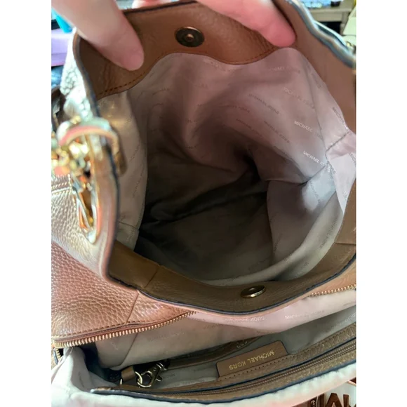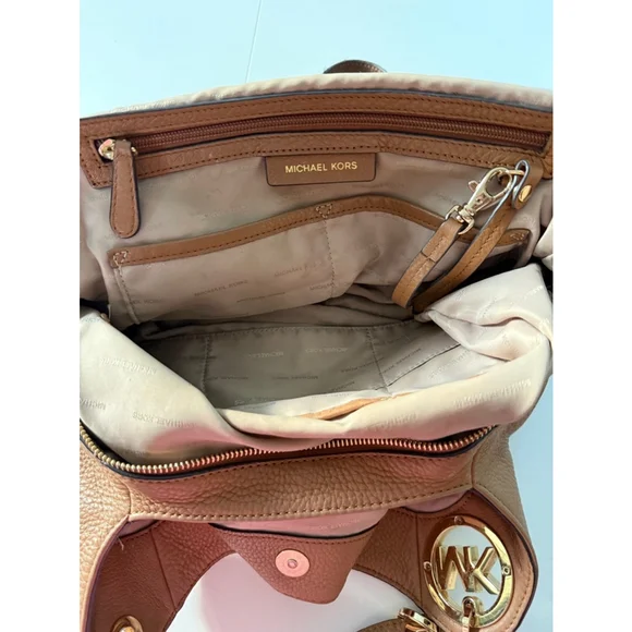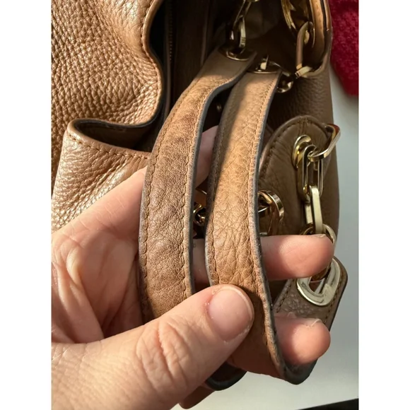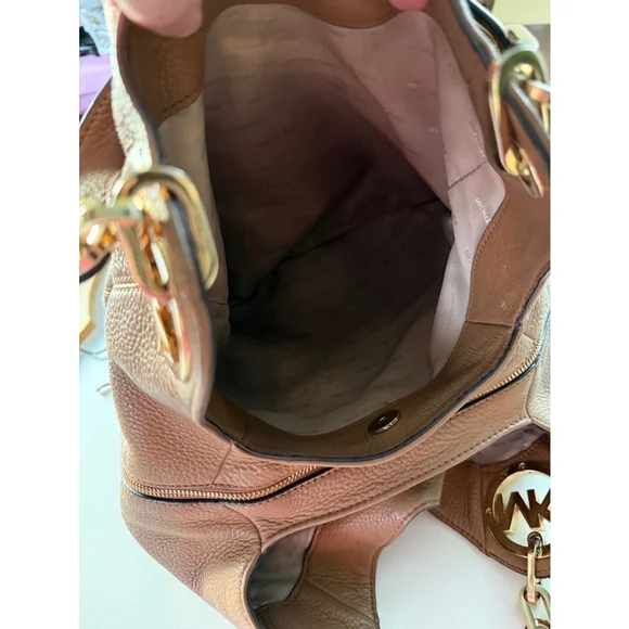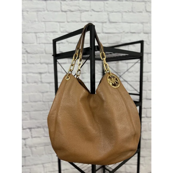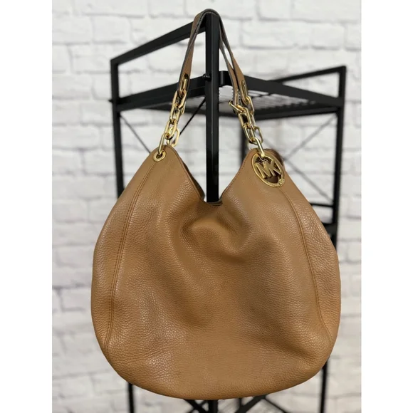 MICHAEL KORS authentic women’s brown fulton large pebble leather shoulder bag with gold-tone hardware. The bag features a chain and leather shoulder strap, a zip closure, and an MK logo medallion. Interior includes multiple pockets. The leather straps shows some signs of wear consistent with pre-owned condition. One side of bag has some spotting which is shown in the photos. Authenticity is verified by ShopAuthentic.PLEASE NOTE: Mannequin in photos is a SIZE SMALL. Some items may not fit you as they do the mannequin. mannequin is used for display purposes only. This is a second hand, preloved garment. This means that this article of clothing has been worn/washed before and may have signs of wear. While I do my best to identify all and any flaws, it is possible that I may miss something. Any flaws discovered will always be disclosed in the items listing. #MK #leather #designer #preloved