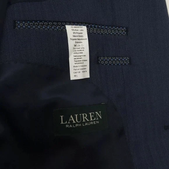 Description: NWOT Lauren Ralph Lauren Wool Blend Stretch 2 Button Blazer Sport Coat Jacket -Two button closure-Two front flap pockets-Left chest pocket-Single vented back-Four button cuffs-Notch collar-Natural stretchSize (Check Measurements): Mens 44 LColor: BlueFabric: 70% wool and 30% polyesterCondition: New Without TagsItem#: 65513Measurements are in inchesArmpit to armpit: 23"Back bottom of the collar to the hem: 31 3/4"Shoulder to shoulder: 19 1/2"Shoulder seam to end of cuff: 26 1/2"BUYING VINTAGE·We do our best to thoroughly inspect all items for any visible imperfections i.e., rips, repairs, holes, stains, etc. and note as such.·Please note vintage sizes are not always comparable to today's sizing. Please refer to the measurements in the description for a more accurate depiction of the true size. If an issue should arrive, please contact us prior to leaving a negative as we strive for providing excellent customer service.Please compare your measurements to the measurements provided in the listing description to ensure a proper fit.