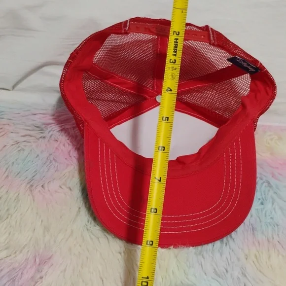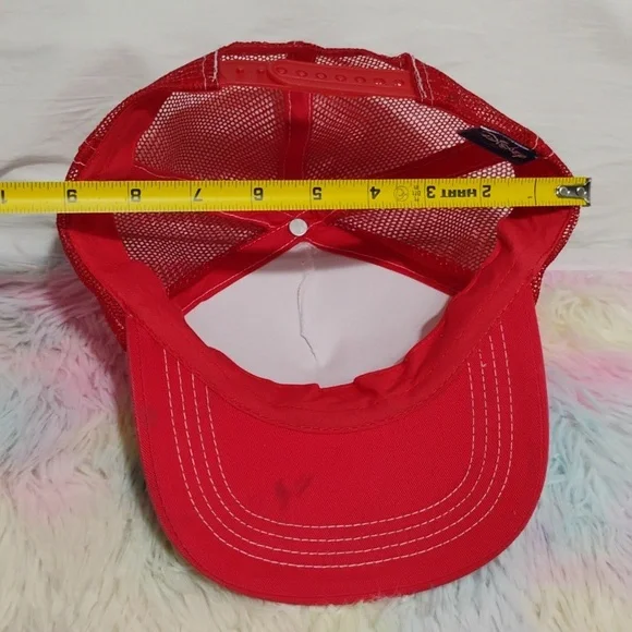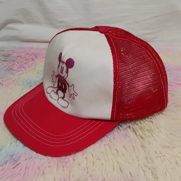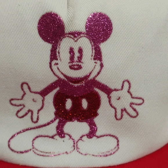 RARE!! Haven't seen another like this one!!Disney Mickey Mouse Vintage Glittery Adjustable Snap Back Hat!! Has some spots of light discoloration as shown in pictures that can possibly be removed but is due from age. Otherwise it's beautiful! The tag reads that it's a Junior but seems like it would be a OSFA with the snap back and it's made big. Can fit adults! Smoke and pet free home! Reasonable offers always welcome!See pictures for measurements!