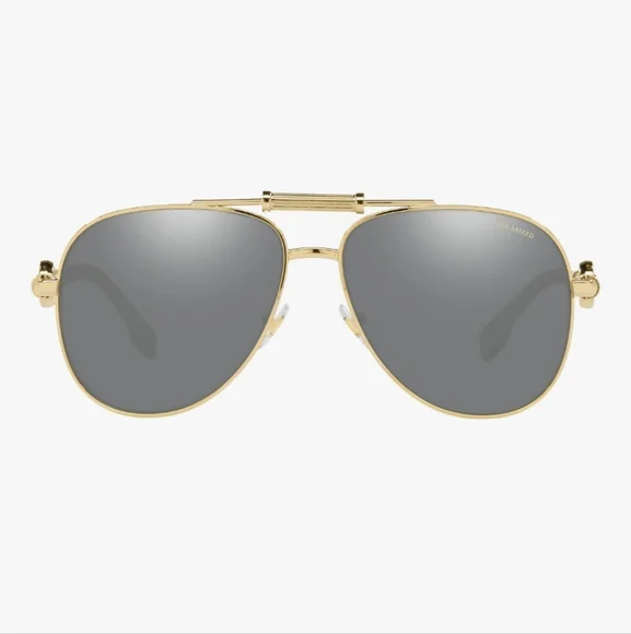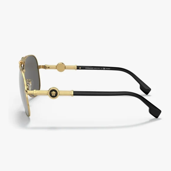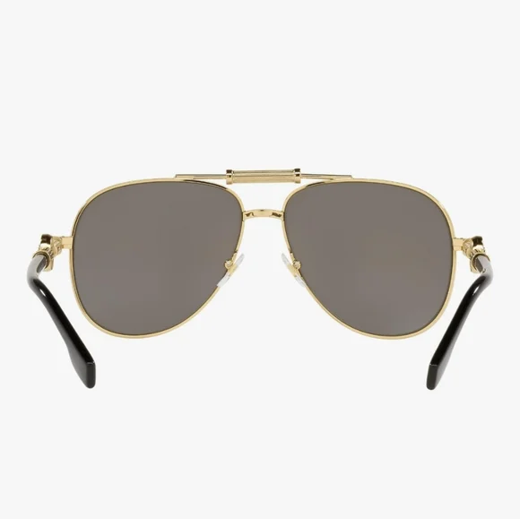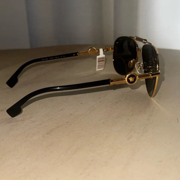 Stylish aviator sunglasses with gold frames and black lenses. Perfect for a chic look.Brand: VersaceFrame color: GoldLens color: Dark grayFrame material: MetalCondition: New in boxArm Length:140 MillimetersBridge Width:14 MillimetersLens Width:59 Millimeters*Authentic item**Ships between 2-7 business days excluding holidays**Box, case, and dust rag all included**Tag may sometimes be attached to the bottom of the box**Hit the ❤️ button for free shipping