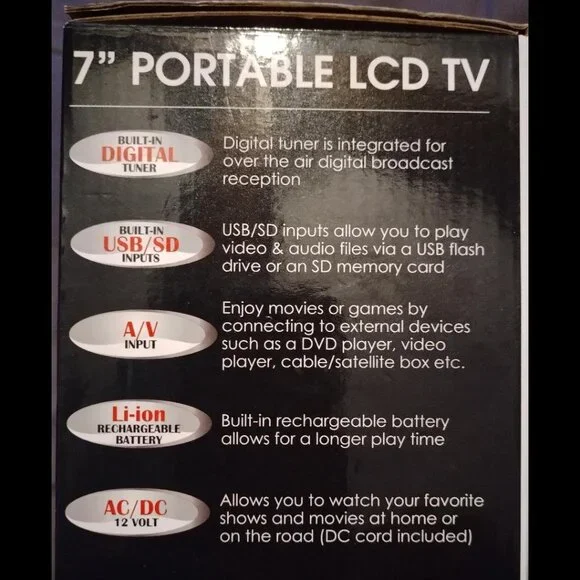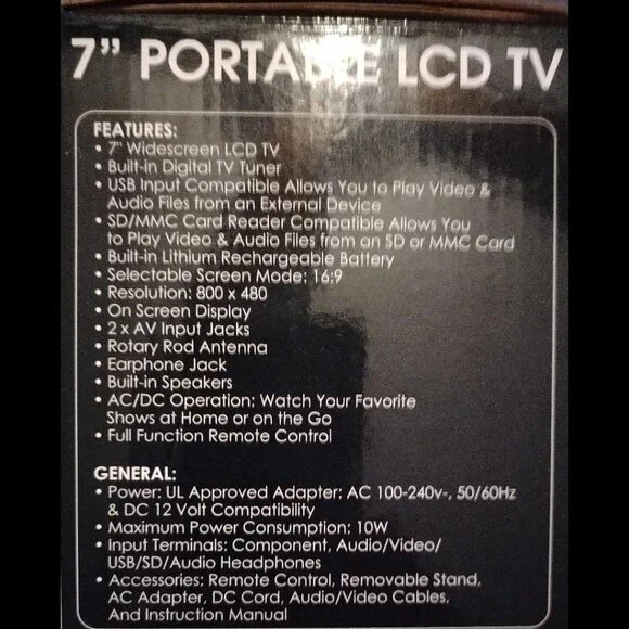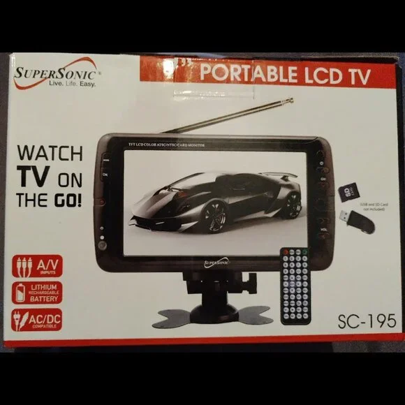 Watch your favorite TV shows on the go like sports, movies, etc., with this 7" TFT Portable Digital LCD TV. It features a built-in digital TV tuner, rechargeable battery, and remote control. Watch your favorite shows anywhere and anytime. Brand New-IN Box.SUPERSONIC Portable Digital LCD TV, AC/DC, Compatible with Home, Flight, Train, Car, and RV/Boat. The perfect gift to start your holiday shopping early!SuperSonic SC-195 7" Portable Widescreen LCD Display w/ Digital TV Tuner, USB/SD• Earphone Jack• TV Stand Included• Full Function Remote Control (included)• Power: UL Approved Adapter:AC 100-240V, 50/60Hz & DC 9-12Volt Compatibility• Maximum Power Consumption: 18 Watts• Input Terminals: Component,Audio/Video/Audio Headphones• Accessories: Remote Control, ACAdapter, Car Cord, A/V Cables,Rod Antenna and Instruction Manual