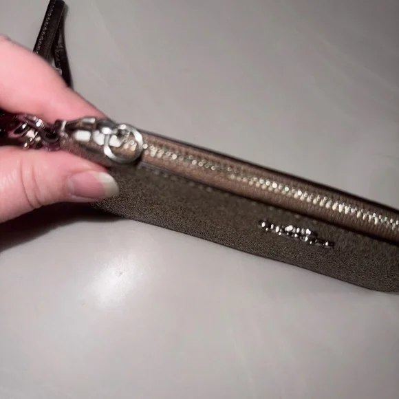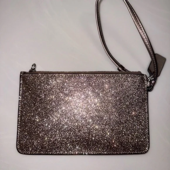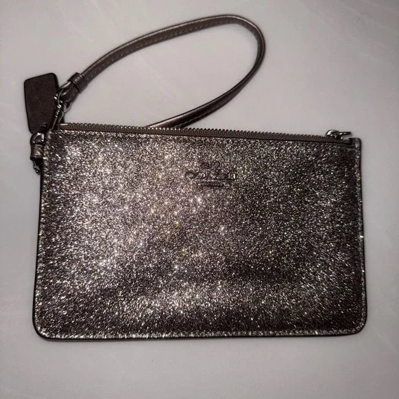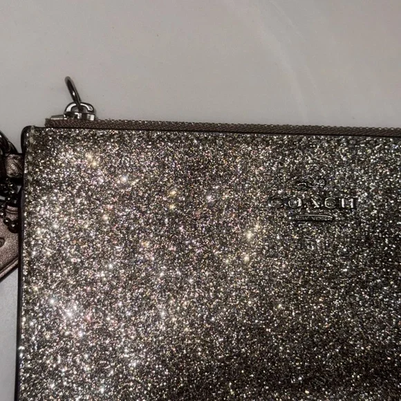 Shimmer with style using the Coach Glitter Wristlet. This champagne glitter accessory is perfect for any occasion, adding a touch of sparkle to your ensemble.No callouts. Wristlet strap attaches to zipper pull on wristlet per usual or can attach to the side ring as shown. Hangtag attached to wristlet as well. All items sold as is, please inquire for additional questions.
