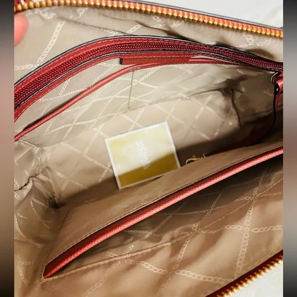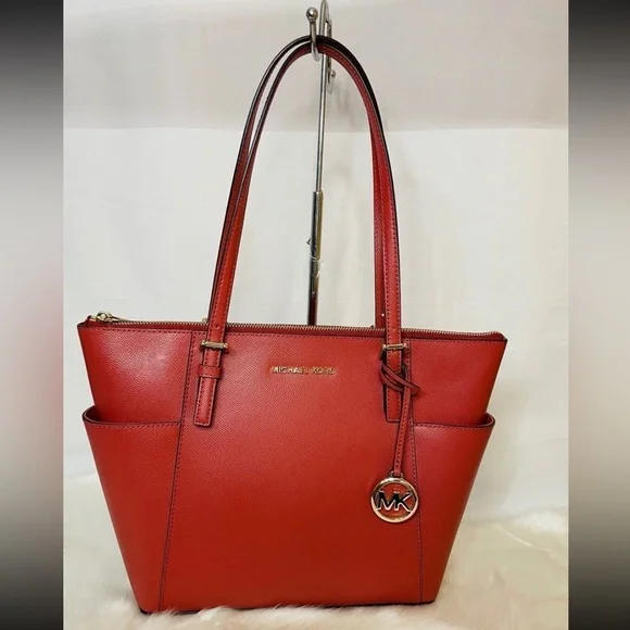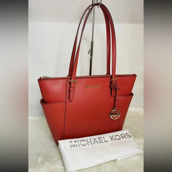 MIchael Kors Charlotte Tote BagMaterial: Saffiano leather/trimmed leather Color:metallic orange red/ gold tone hardware Measures: 15” W x 10” H x 4.5”DHandle:10” dropInterior: lining 100%polyester zip and slip pocketExterior: side slip pocketColor may slightly vary due to lighting Comes with a dust bag