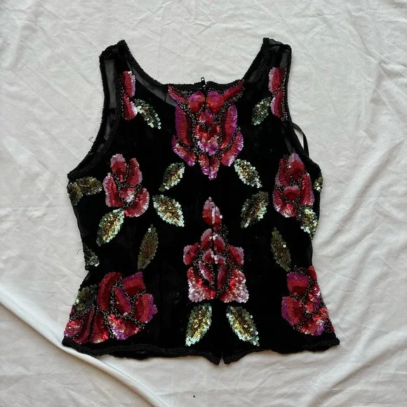 Black and red rose sequin tank top with mesh detailing♡ size: medium♡ brand: boston properdescription♡ boston proper beautiful beaded sheer top♡ colors: red, baby pink, magenta, green, forest, black, white♡ thick tank top straps♡ zipper closure♡ scope neck♡ Sheer vintage top♡ Gorgeous multicolored sequin and beaded flowers and leaves on the sheer fabric♡ The most beautiful vintage top I've ever found♡ bead sequin stud beaded studded embellished details♡ y2k mermaid fairy core asymmetrical beaded top in black♡ popular vintage style♡ bead sequin stud beaded studded embellished details♡ viral on pinterest Perfect for festivals like coachella, rave, and concerts#veaded #sequin #sheer #stud #floral