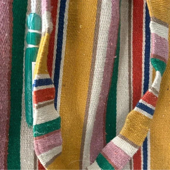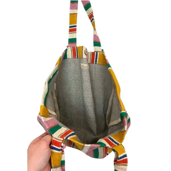 ✨Brand New - Nalini X-Large Woven Multi-Color Tote Bag✨The image shows a Nalini Originals XL Tote Bag, featuring a colorful striped pattern with shades of yellow, green, red, pink, and blue. The bag is made from a blend of polyester, cotton, and jute. It has a rectangular shape, double handles in a matching striped fabric.The bag is designed with an extra-large size, making it suitable for various uses, from shopping to travel. Tote bags like this are popular for their versatility and can be made from various materials, including cotton, canvas, jute, and leather. They are frequently used as everyday bags, for shopping, or even as a fashion statement.