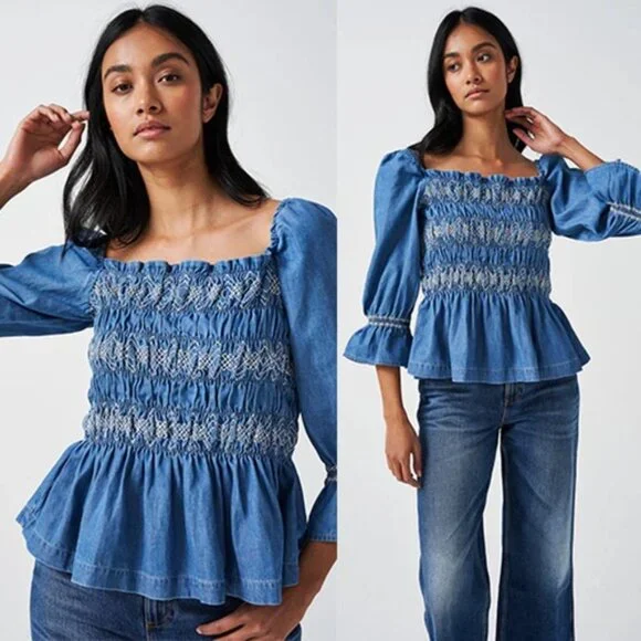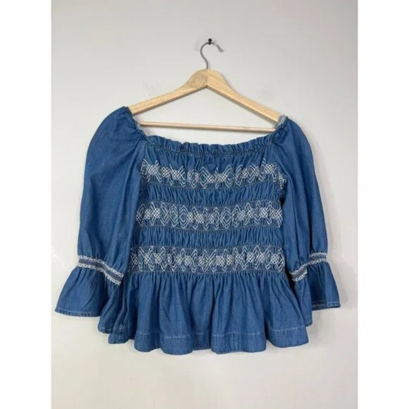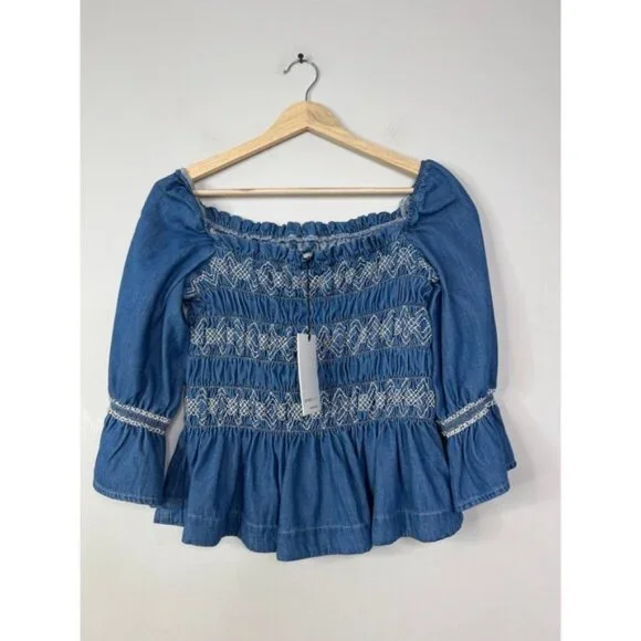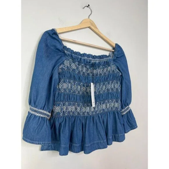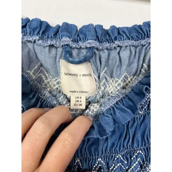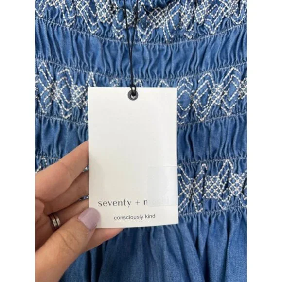 Seventy + Mochi Sally Top 3/4 Sleeve Square Neck Top BlueRodeo Vintage. New with tag!Size: 4Fabric: 65% certified organic cotton, 32% lyocell tencel, and 3% viscose,Your favorite dress comes reimagined as a top, to go with any of your seasons' jeans and skirts.Shirring bodice with square neck3/4 sleeve with elasticated cuff and shouldertop, blouse, womens, blue, casual, summer, fall, spring, squareneck, smocked, solid, denim, quartersleeve, winter, casualSeventy + Mochi Sally Top 3/4 Sleeve Square Neck Top Blue Rodeo Vintage