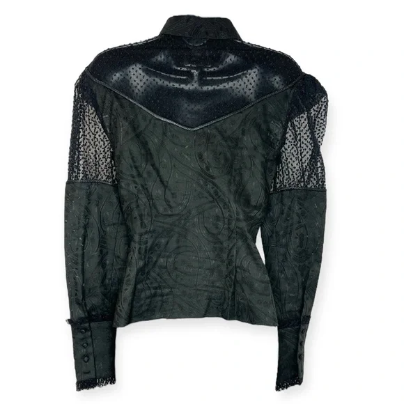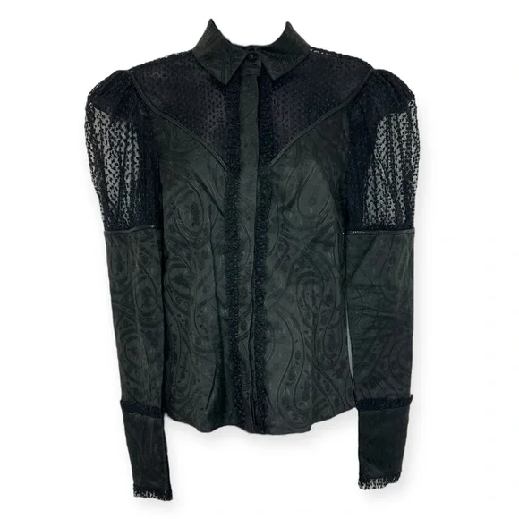 ALEXIS Virginia Top in Black. Long sleeves. Collared. Gathered shoulders. Front button closure. Floral eyelet detail. Sheer mesh yoke. Sleeve panels. Ruffle trip. Cotton blend. Size small. In great pre-owned condition, light wear on tag. B34", L22".mesh trimIn-Store Item ID: 91030• Brand - ALEXIS• Size - Small• Color - Black• Material - Cotton blendPowered by Peeps