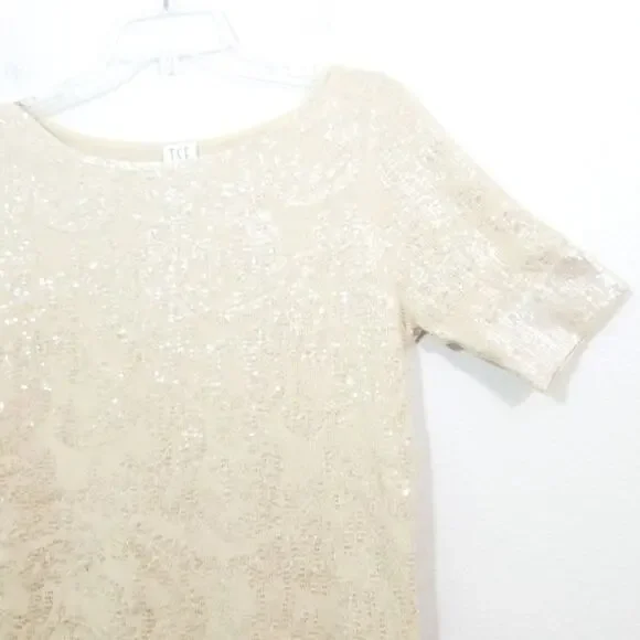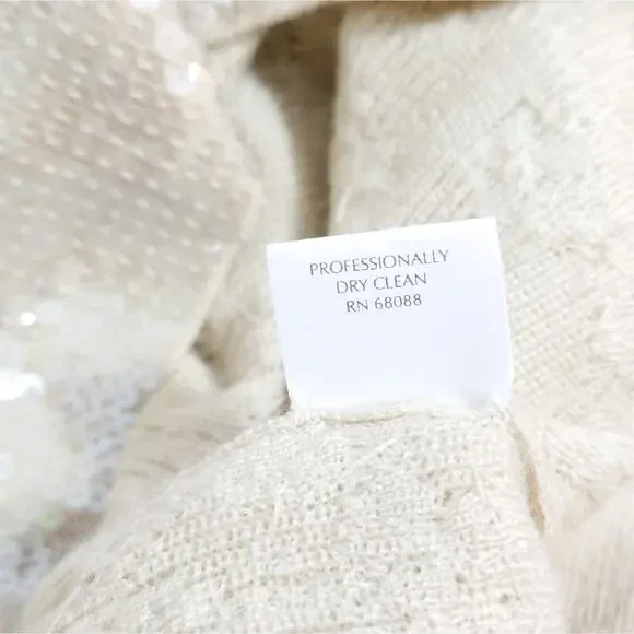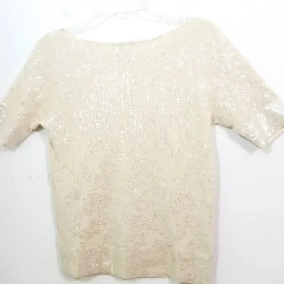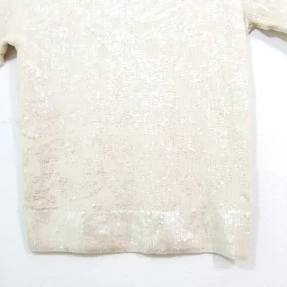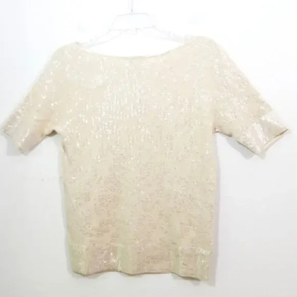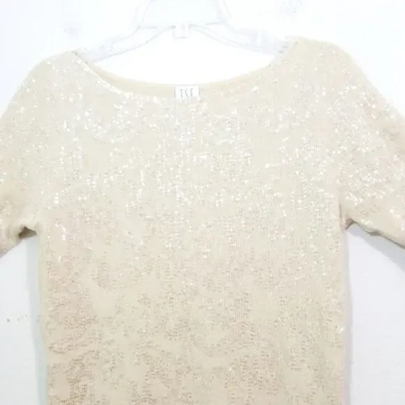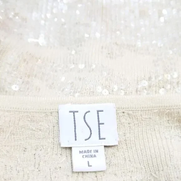 TSE 100% Cashmere clear sequin covered cream sweater knit top Gorgeous, luxurious, chic and softExcellent condition worn just once Size LBust aprx 34Sleeves aprx 10.5Total length 23.5I try to describe items as well as possible.Due to silly returnsUSED ITEM DISCLAIMER:This item may have the following:Show signs of wear such as fading, thinning, piling, scratches, scuffs, scrapes, stretching, etc. May not have tags such as material content, size or care tags,May have itchy, thicker, thinner material or material that doesn't breathe,May come from a pet friendly home,May have smells such as perfume, musk, smoke, laundry detergent etc. (items are cleaned),May have been altered (please see provided measurements),May have imperfections,May have manufacturers flaws such as twisted seams, uneven seams, glue ooze such as in shoes, loose or crooked stitching,May be a different color shade then photos or computer show,May not be comfortable.