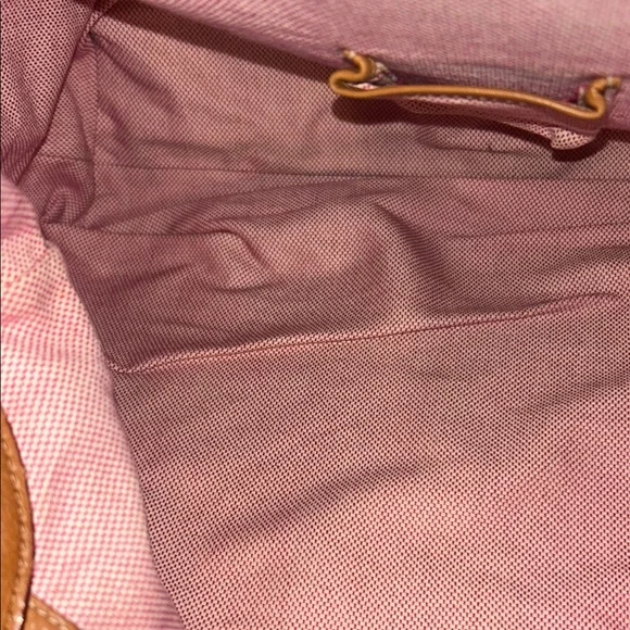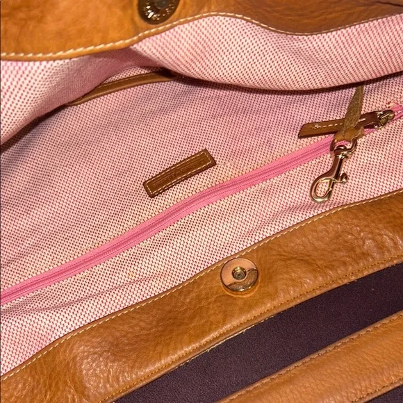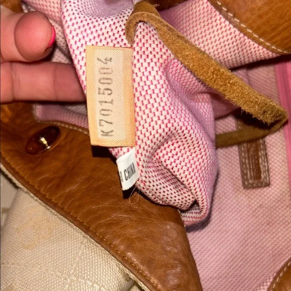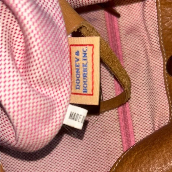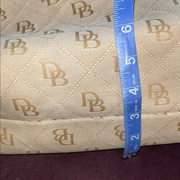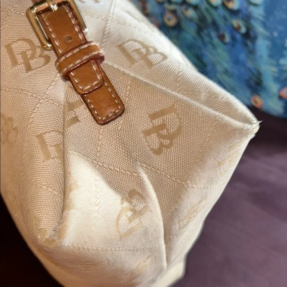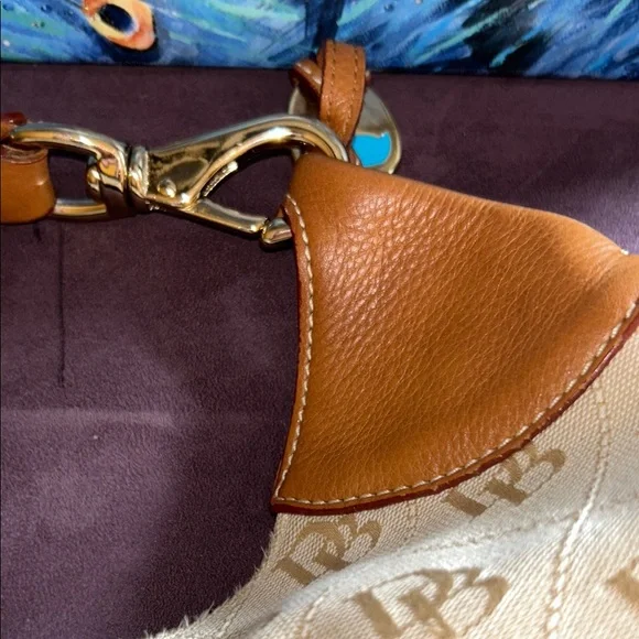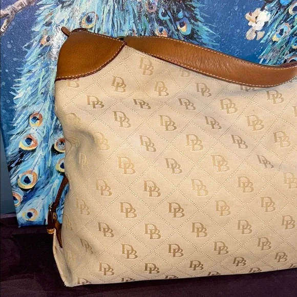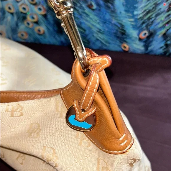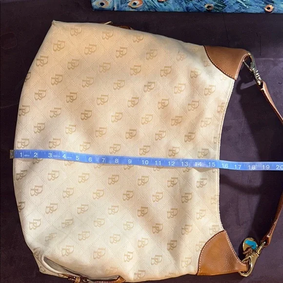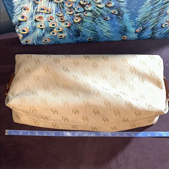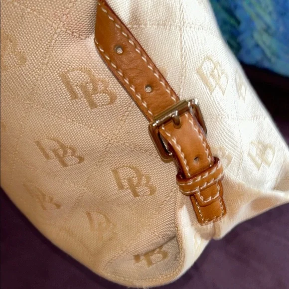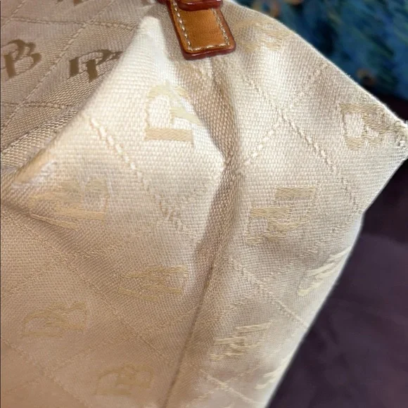 This Dooney & Bourke shoulder bag showcases a sophisticated cream and tan color palette, highlighted by a signature monogram print. Crafted with premium materials, it features elegant leather trim and gold-tone hardware, making it a timeless accessory for any occasion.Canvas is predominantly clean, rubbing to corners as shown. Glazing on leather shoulder strap is peeling. Overall a beautiful bag