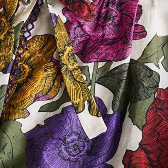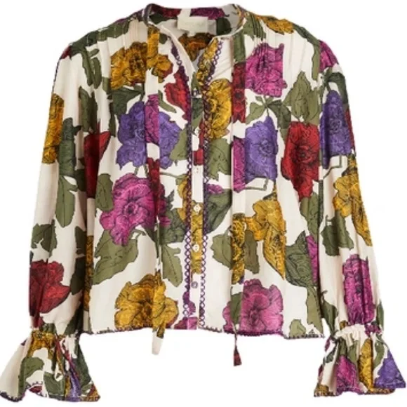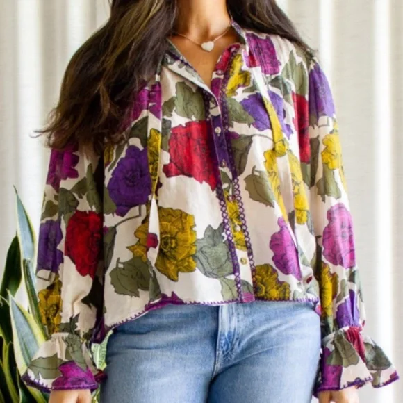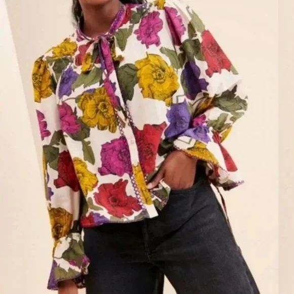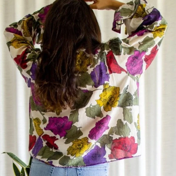 This Carolina K blouse is cut from airy cotton and silk blend and features a bold floral print. Brand New w/Tag*Relaxed Silhouette*Button Front*Pintucks at Shoulders*Neck Tie Closure*Long Sleeves w/Tie Closures*Embroidered Trim *Cotton, Silk*Hand Wash / Dry Clean*ImportedColors: Red, Purple; Multicolor (Rainbow)Approximate Length: 23”Inquire about additional measurements*Product label has a mark to indicate that item cannot be returned to the retail store*