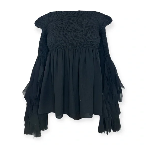 Caroline Constas Alessandra Silk Top in Black. Long sleeves. Off the shoulder style. Smocked chest and shoudlers. Draped ruffle sleeves. Silk. Size medium. with stretch. In excellent pre-owned condition, no flaws. B24", L20".off the shoulderIn-Store Item ID: 91356• Brand - Caroline Constas• Size - M• Color - Black• Material - SilkPowered by Peeps